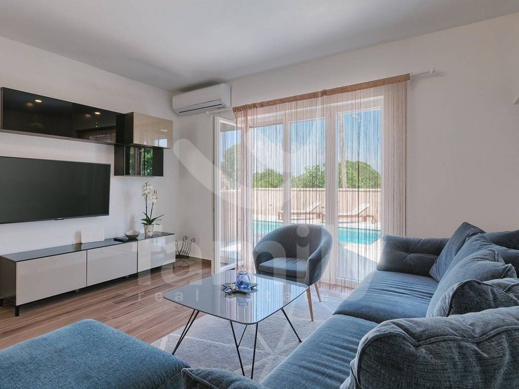 This beautiful villa with an area of 180 m2 on a plot of land of 500 m2 is located in Štinjan, not far from the beaches and the city of Pula. The beautiful villa is spread over two floors. On the ground floor of the villa  there is an entrance hall that divides the property into two sides, on one side there is a beautifully decorated and separate tavern with a fireplace and a space for socializing, while the second part of the ground floor is an open concept living room with a dining room and kitchen, a room that is used as a laundry room, a bedroom with a bathroom and a guest toilet. On the first floor there are three more bedrooms, one with its own bathroom, while the other two rooms share a common one. In addition to the bedrooms, on the first floor there is a beautiful terrace overlooking the pool and the surroundings. The property is equipped with PVC joinery and air conditioning in every room. The front of the property includes two parking spaces and a green area, while on the back there is a 25 m2 swimming pool, a sunbathing area, a storage room and a beautiful terrace.