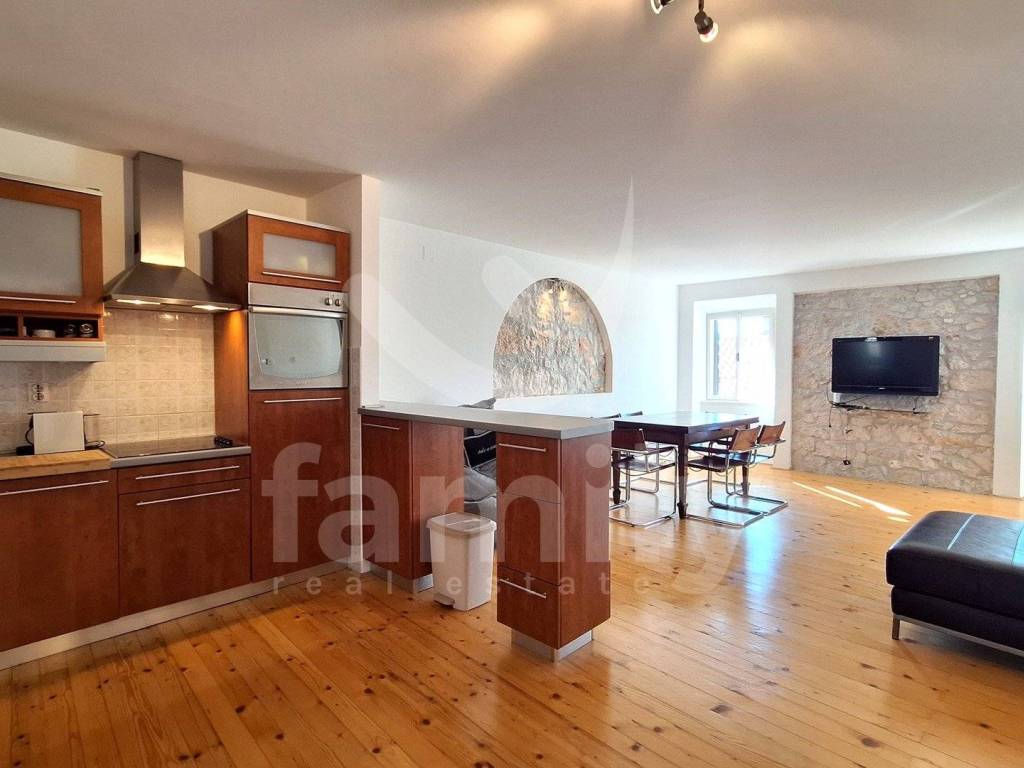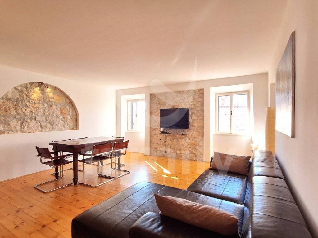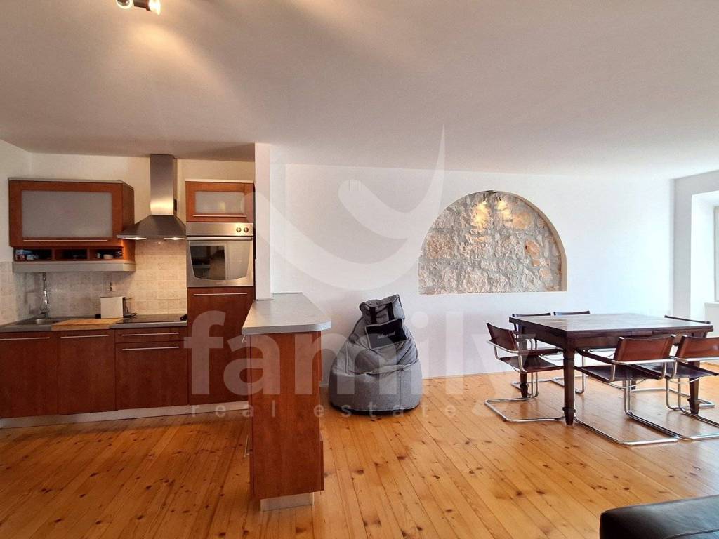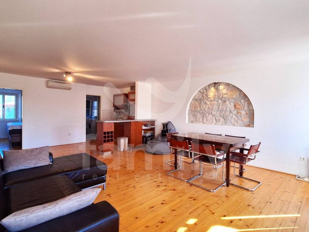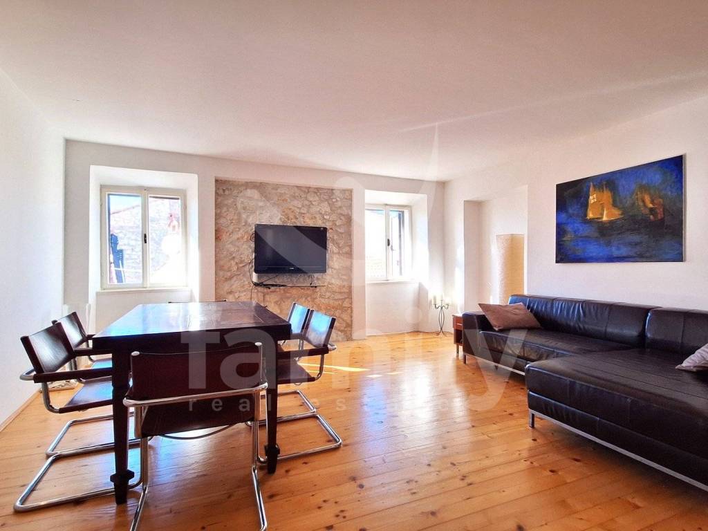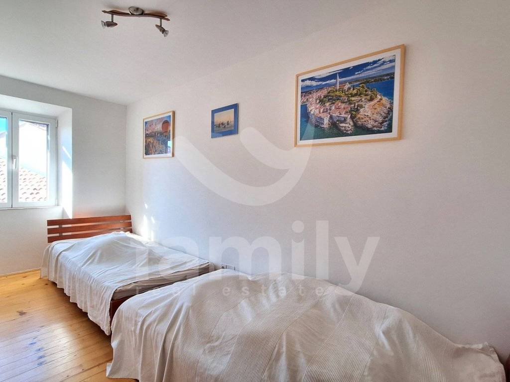 Right in the center of Rovinj is this beautiful, spacious apartment of 80 m2 on the second floor of a small residential building with a spacious storage room within the building's courtyard and a veranda and a courtyard that is for the use of the tenants, which is a rarity considering that the property is located in the old town. The apartment consists of an entrance hall, two bedrooms with built-in wardrobes, a spacious storage room, a renovated bathroom with daylight, an equipped kitchen with a dining area, a spacious living room in which the details of the stone walls were left, which completes the atmosphere of staying in the old town of Rovinj. The heating and cooling system is regulated by external and internal air conditioning units, while the floors are covered with wooden panels and are flat, the apartment is also well-lit since it has many windows. The property is located on the top floor of a small building and above it is an attic space with a view of the sea and the old town. The location of the property is ideal for all lovers of the old town of Rovinj and is close to all supporting facilities, schools, kindergartens, pharmacies, shops, restaurants, etc.