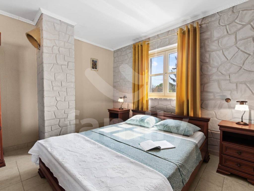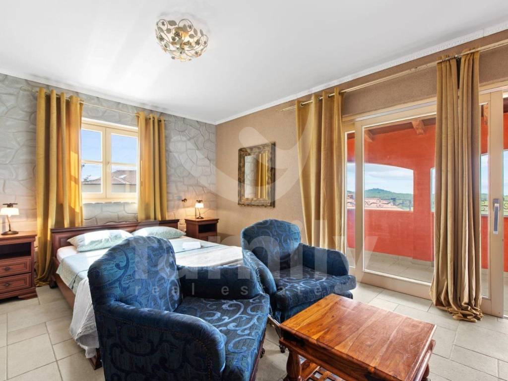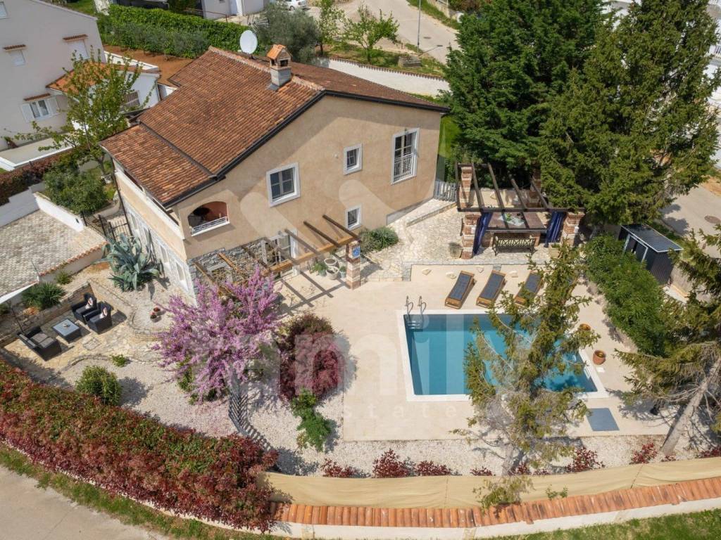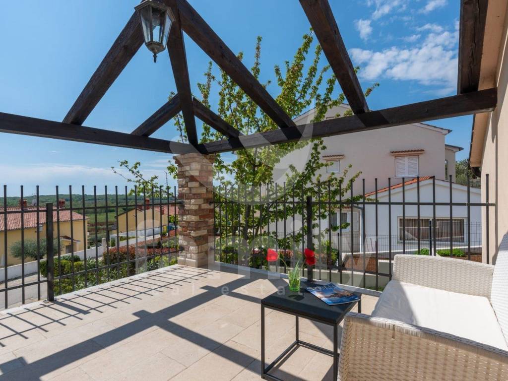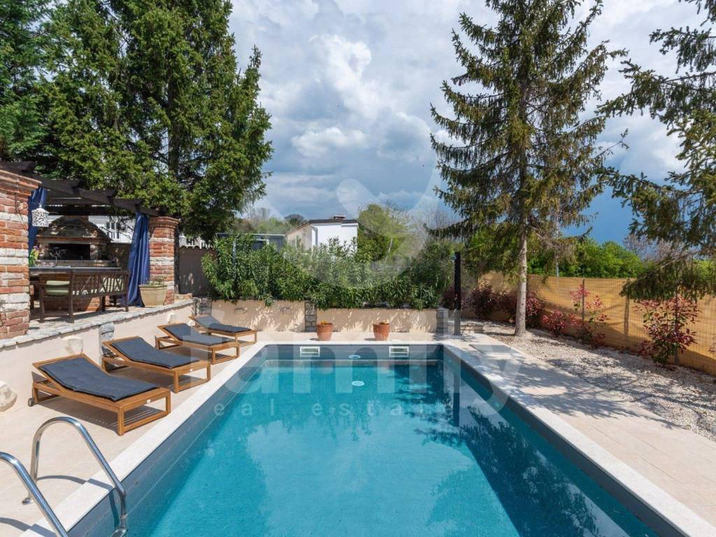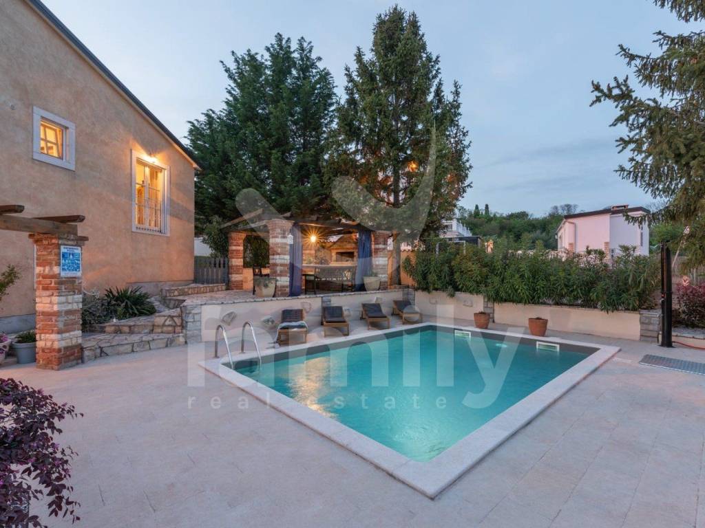Just 4 km from the city of Poreč and its beautiful beaches, there is this beautiful, detached Mediterranean house. This charming house is ideal for a peaceful and relaxing life, because it is located in a quiet and well-maintained settlement. It is surrounded by the entire plot with ornamental plants and a beautiful fence, which provides it with additional privacy. The house covers an area of 180 m² and offers a spacious living room on the ground floor, ideal for family gatherings, with an open space to the dining room and a fully equipped kitchen for enjoying shared meals. In the same room there is also a traditional Istrian fireplace for winter atmosphere. This common area has access to a landscaped garden with a swimming pool and barbecue. On the ground floor there is also one bedroom with a French terrace and access to the garden. A spacious hallway with stairs leads to the first floor. Very practical rooms on the ground floor are two complete bathrooms, one located in the hallway and the other separately in the common living room area.