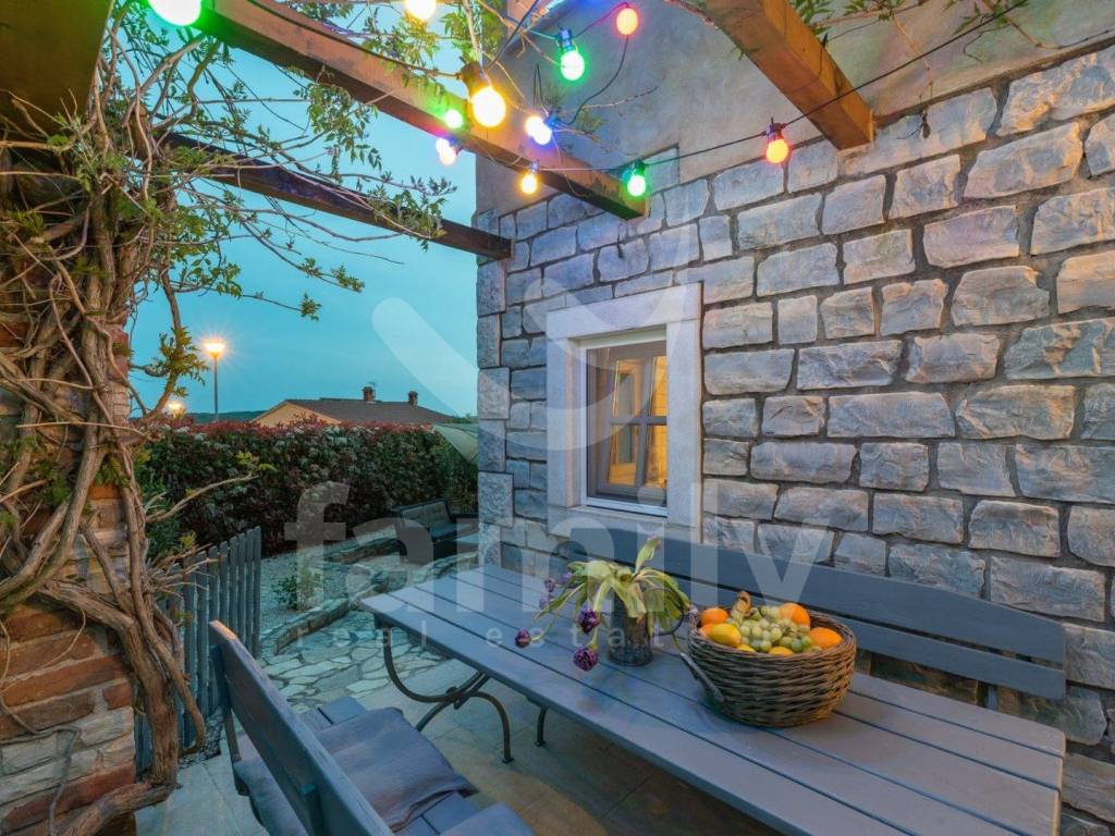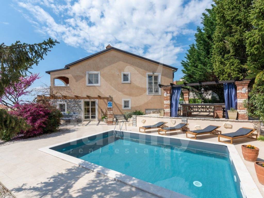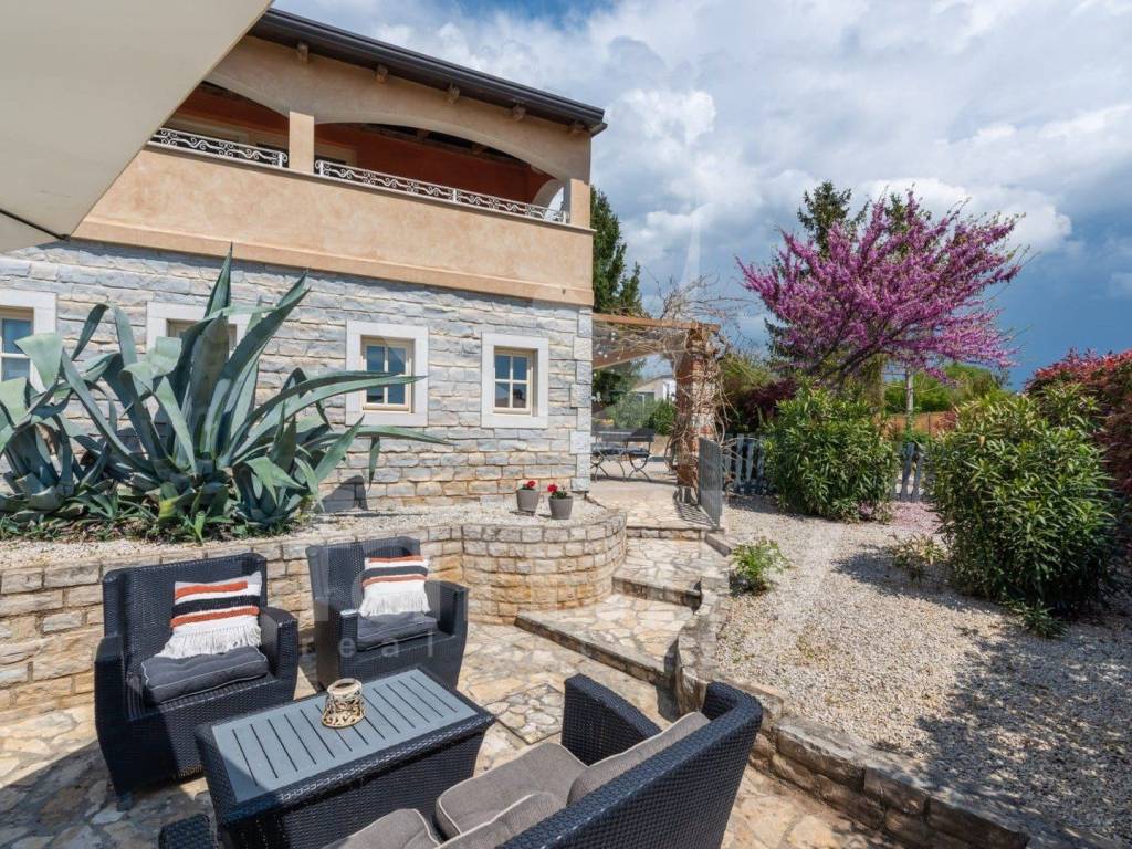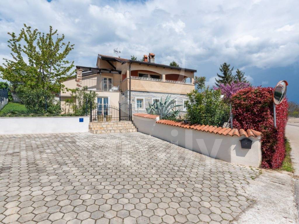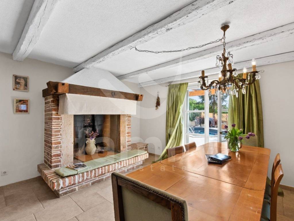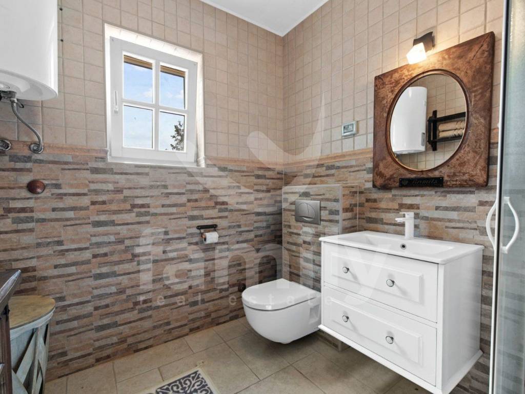 Just 4 km from the city of Poreč and its beautiful beaches, there is this beautiful, detached Mediterranean house. This charming house is ideal for a peaceful and relaxing life, because it is located in a quiet and well-maintained settlement. It is surrounded by the entire plot with ornamental plants and a beautiful fence, which provides it with additional privacy. The house covers an area of 180 m² and offers a spacious living room on the ground floor, ideal for family gatherings, with an open space to the dining room and a fully equipped kitchen for enjoying shared meals. In the same room there is also a traditional Istrian fireplace for winter atmosphere. This common area has access to a landscaped garden with a swimming pool and barbecue. On the ground floor there is also one bedroom with a French terrace and access to the garden. A spacious hallway with stairs leads to the first floor. Very practical rooms on the ground floor are two complete bathrooms, one located in the hallway and the other separately in the common living room area.