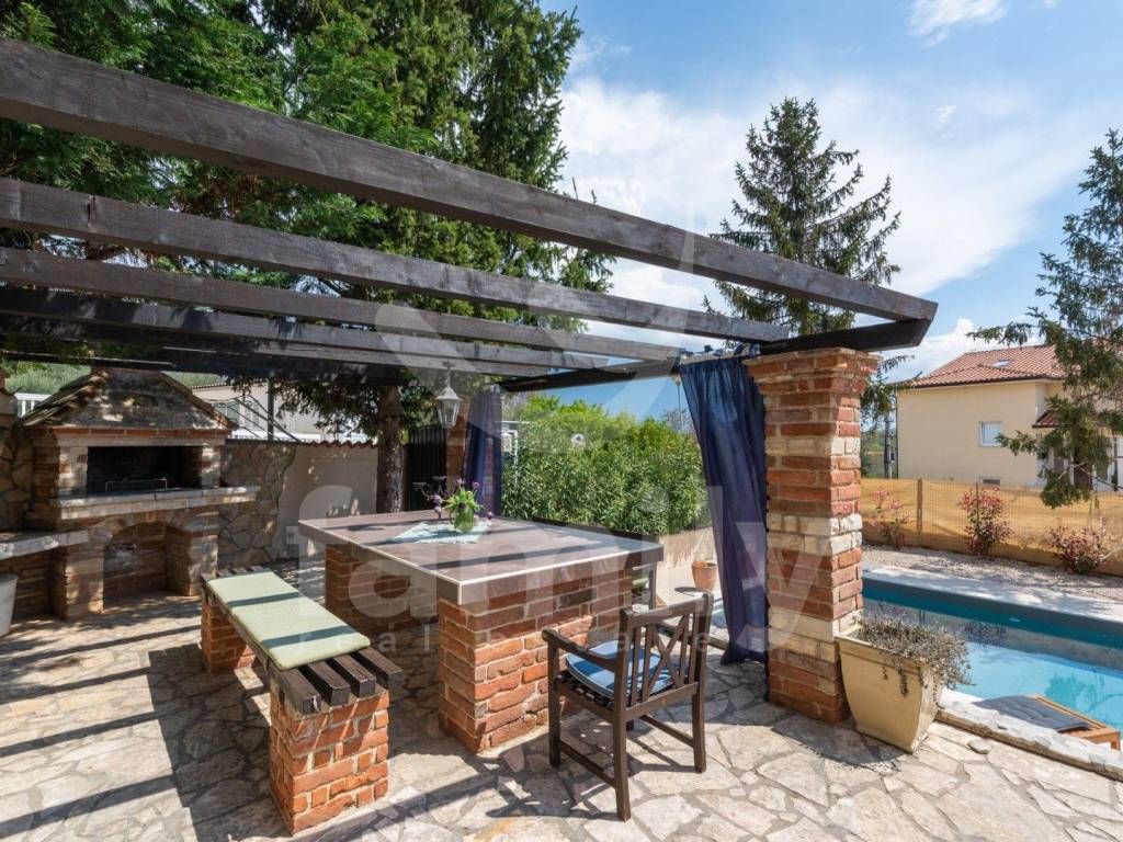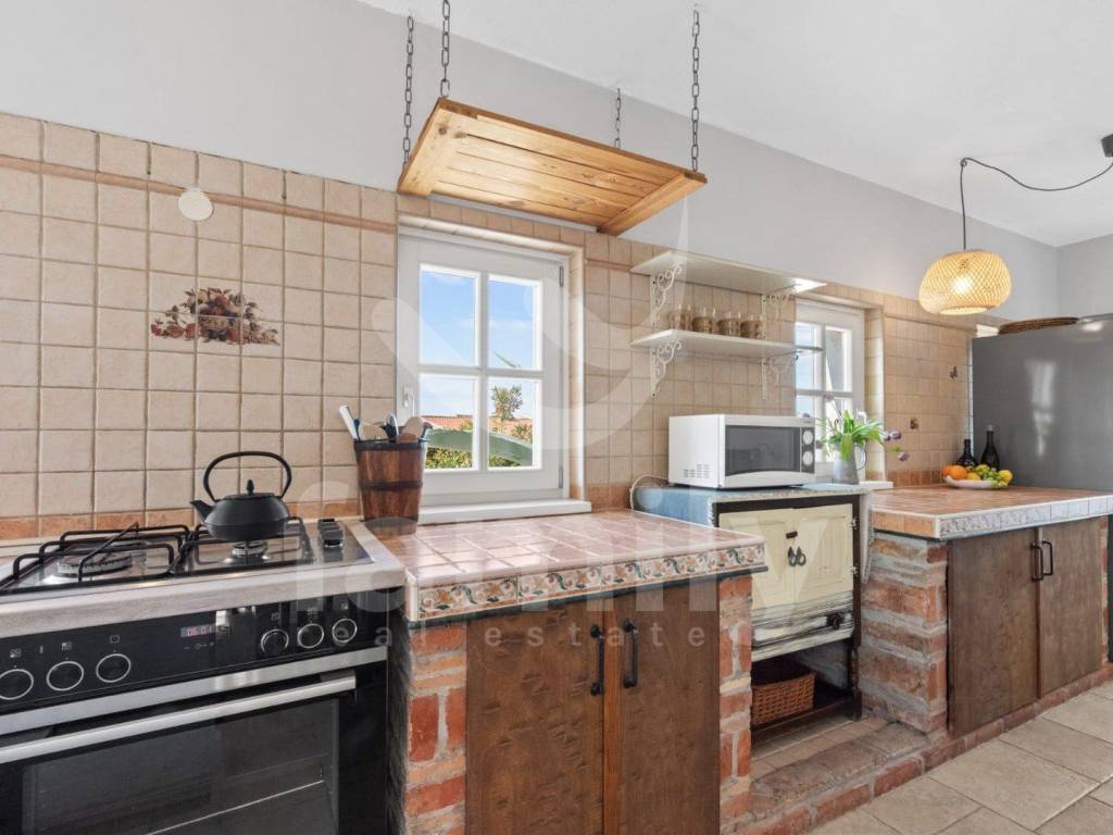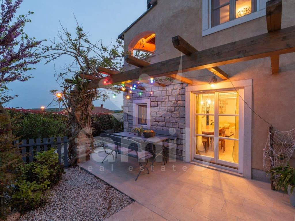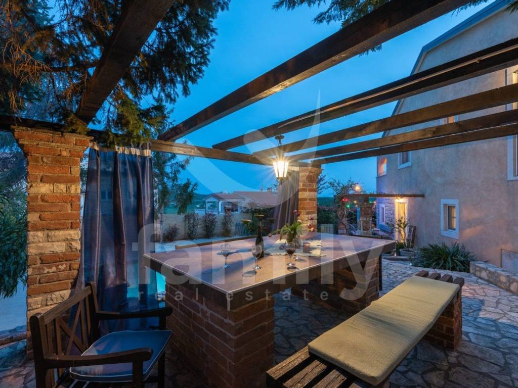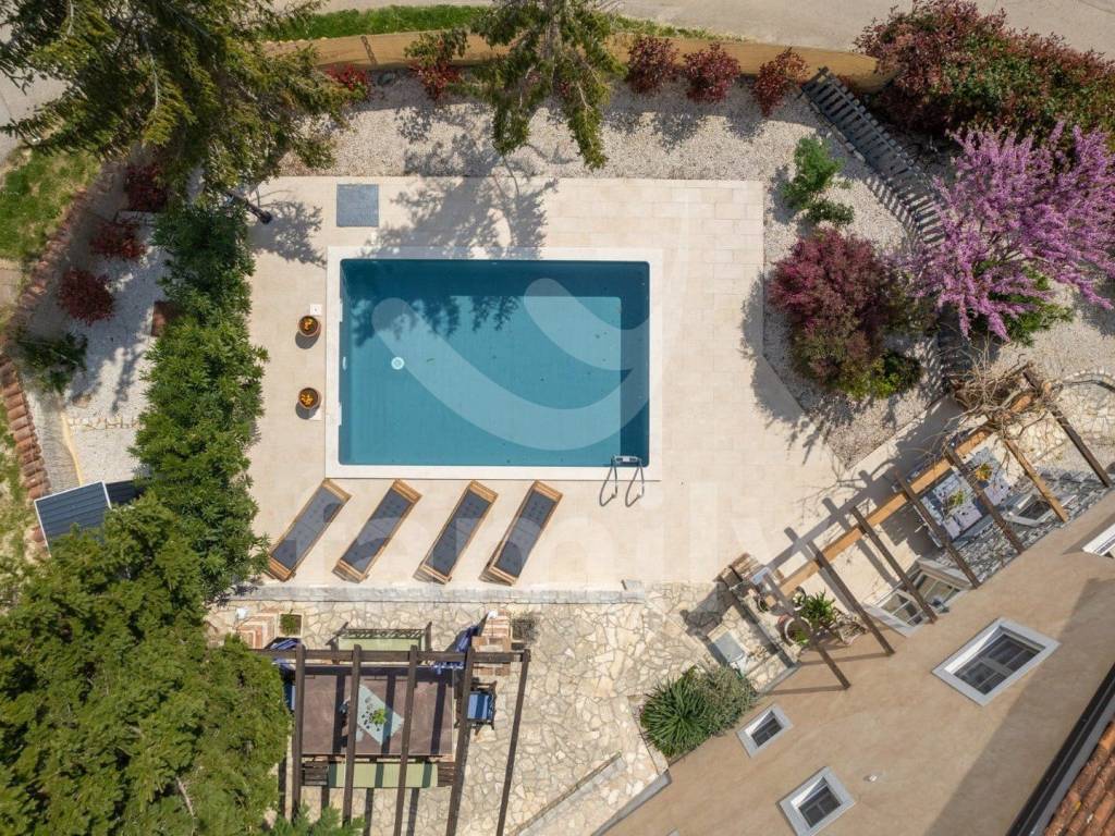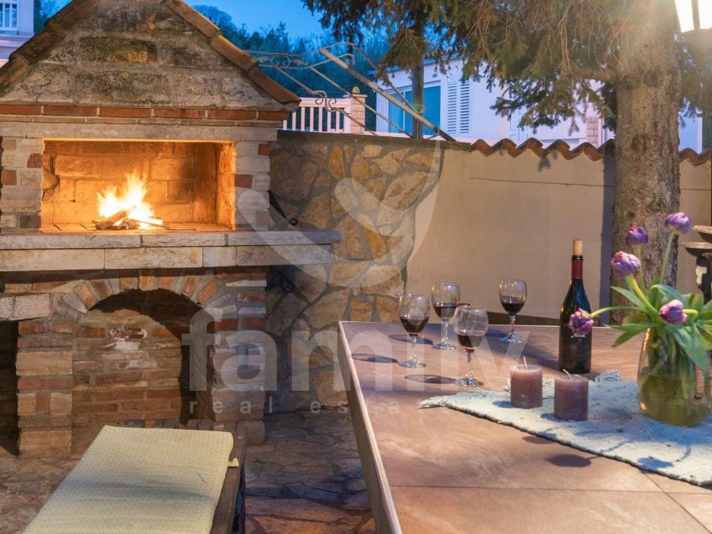 Just 4 km from the city of Poreč and its beautiful beaches, there is this beautiful, detached Mediterranean house. This charming house is ideal for a peaceful and relaxing life, because it is located in a quiet and well-maintained settlement. It is surrounded by the entire plot with ornamental plants and a beautiful fence, which provides it with additional privacy. The house covers an area of 180 m² and offers a spacious living room on the ground floor, ideal for family gatherings, with an open space to the dining room and a fully equipped kitchen for enjoying shared meals. In the same room there is also a traditional Istrian fireplace for winter atmosphere. This common area has access to a landscaped garden with a swimming pool and barbecue. On the ground floor there is also one bedroom with a French terrace and access to the garden. A spacious hallway with stairs leads to the first floor. Very practical rooms on the ground floor are two complete bathrooms, one located in the hallway and the other separately in the common living room area.