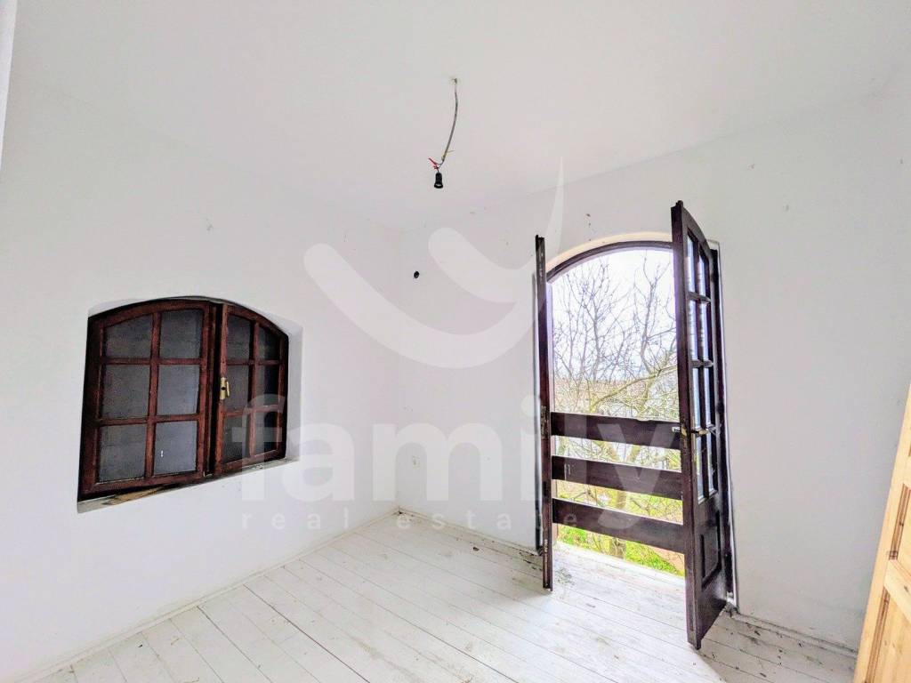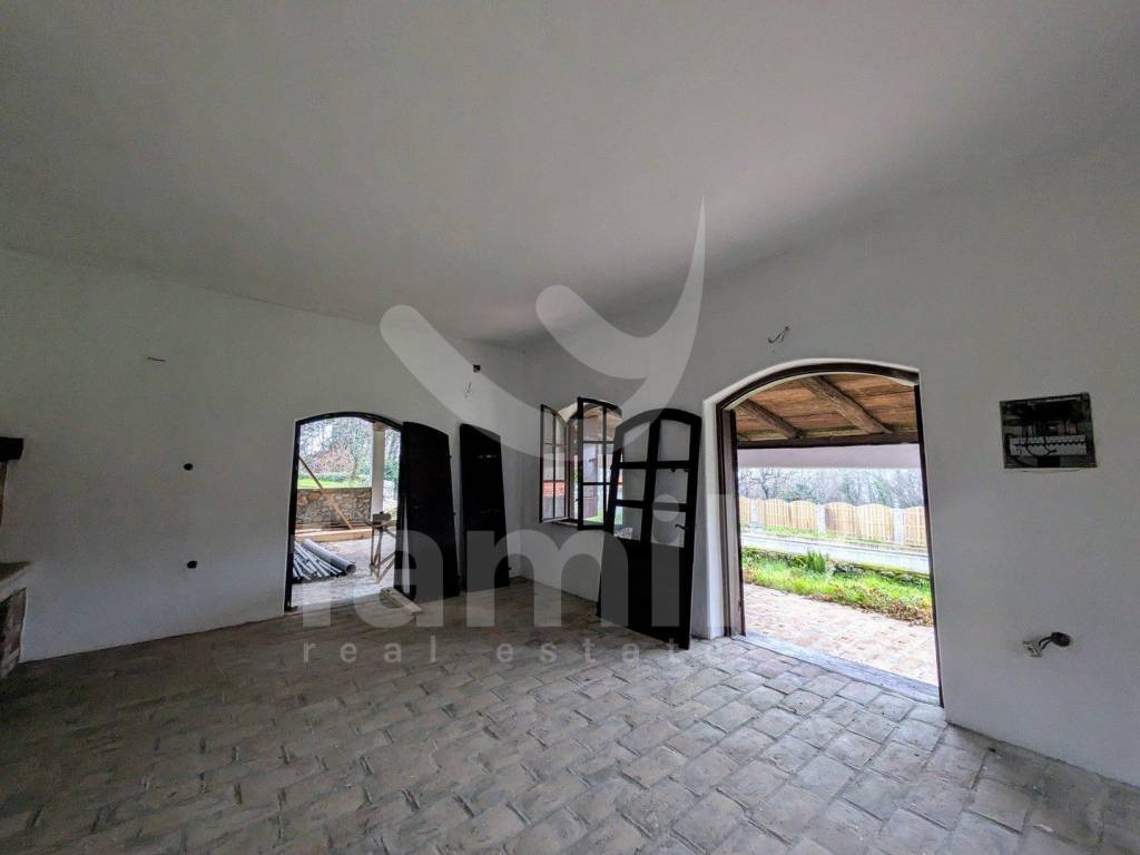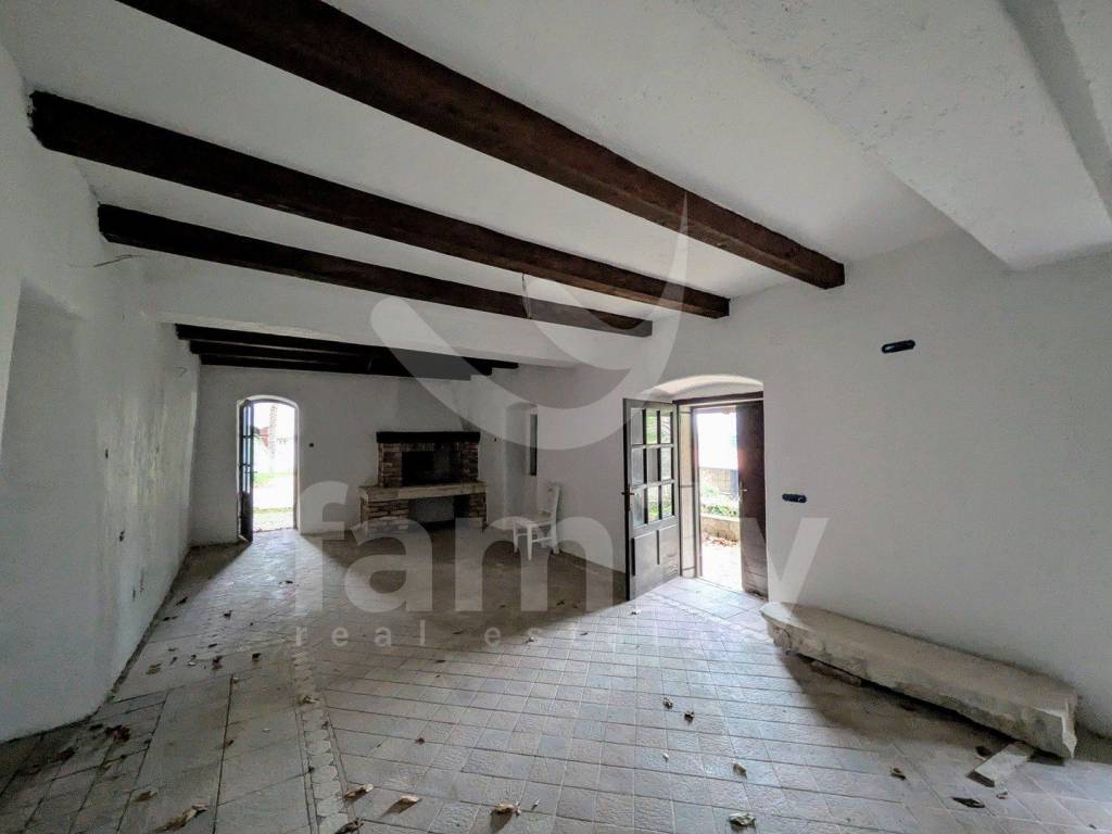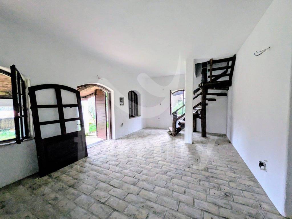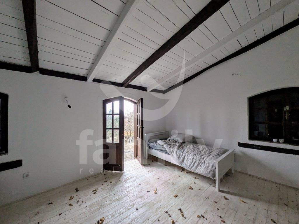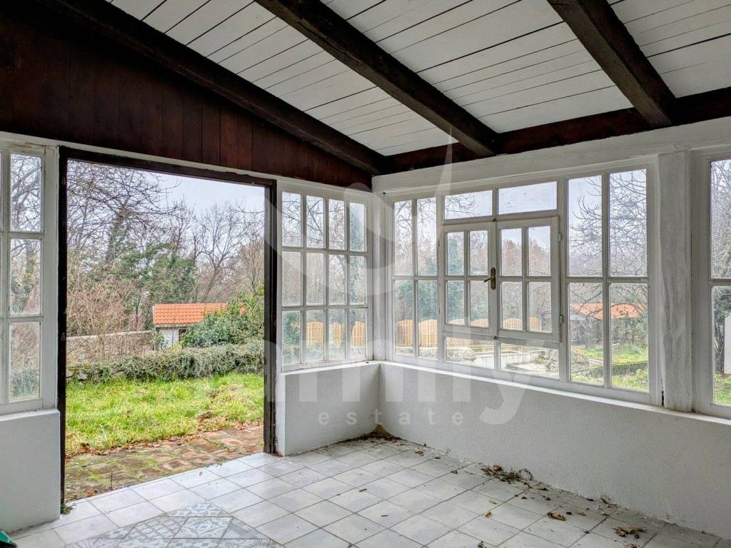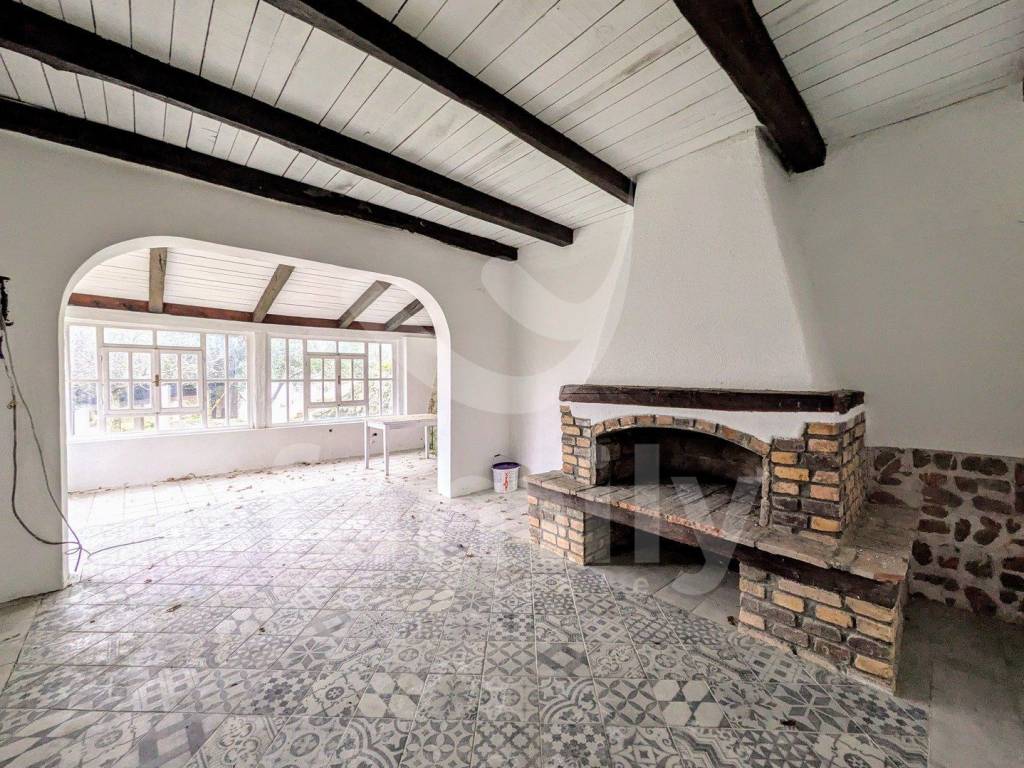 Ground floor: main room with two fireplaces, bedroom, bathroom, glass wall, access to the garden.