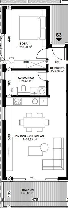 Dnevni boravak + kuhinja + blagovaonica - 26,55 m2