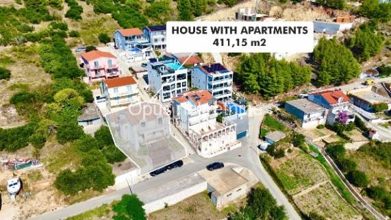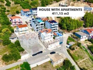 Prodaje se kuća na 3 kata s apartmanima u mjestu Omiš, 411,15 m2 korisnog prostora s pomoćnim objektom 36,45 m2 (moguca 2 apartmana), predivan pogled, parking mjesta, 5 min od mora. Uz blagu renovaciju ova kuća je izvrsna poslovna prilika za turizam