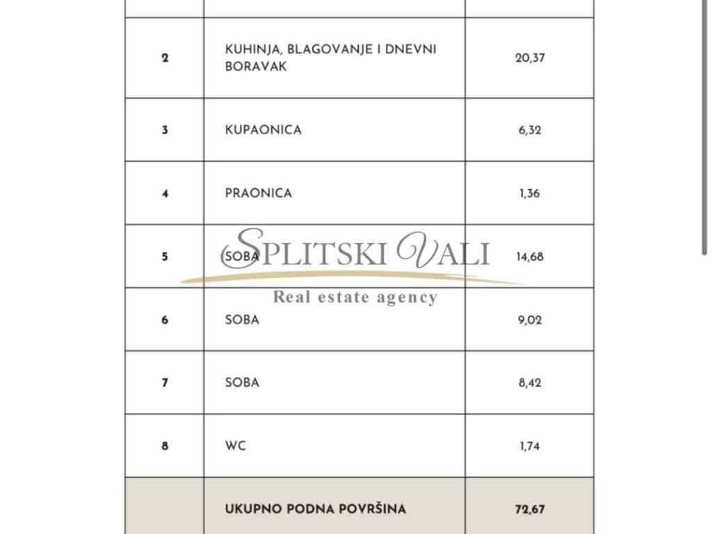 Sastoji se od hodnika, dnevnog prostora s kuhinjom i blagovaonicom,kupaonice,WC-a, tri spavaće sobe te prostranog balkona od 52,26 m2.