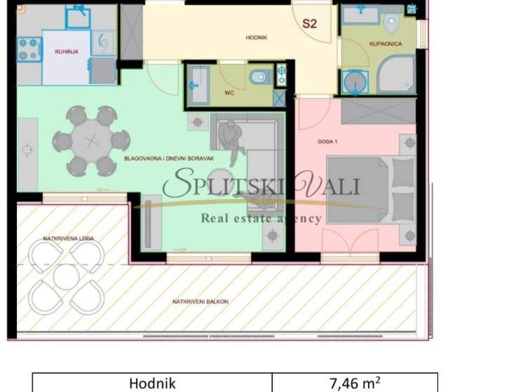 Stan A2- smješten na 1.katu zgrade, sastoji se od: hodnika, kupaonice, wc-a, dvije spavaće sobe, kuhinje s blagovaonicom, dnevnog boravka, lođe, parkirnog mjesta ukupne površine 91,78m2.