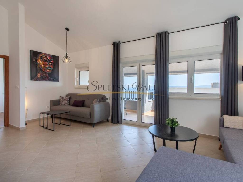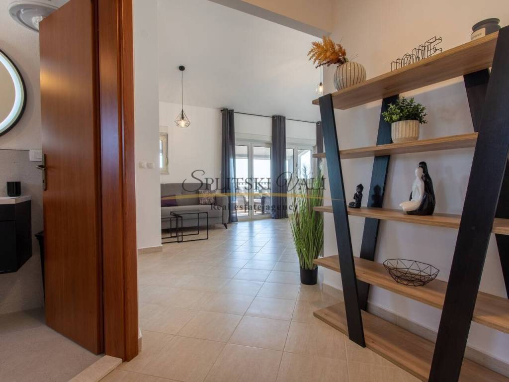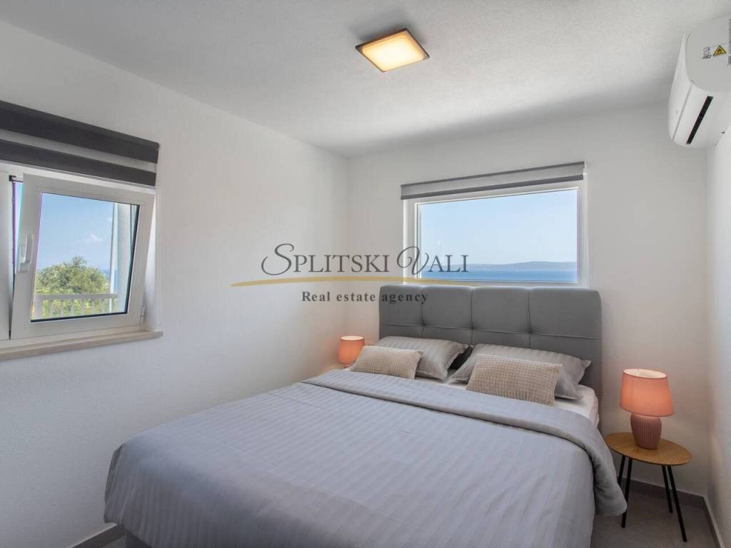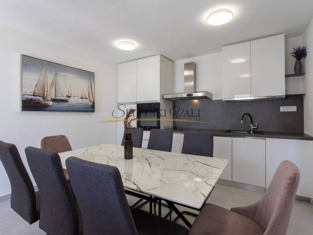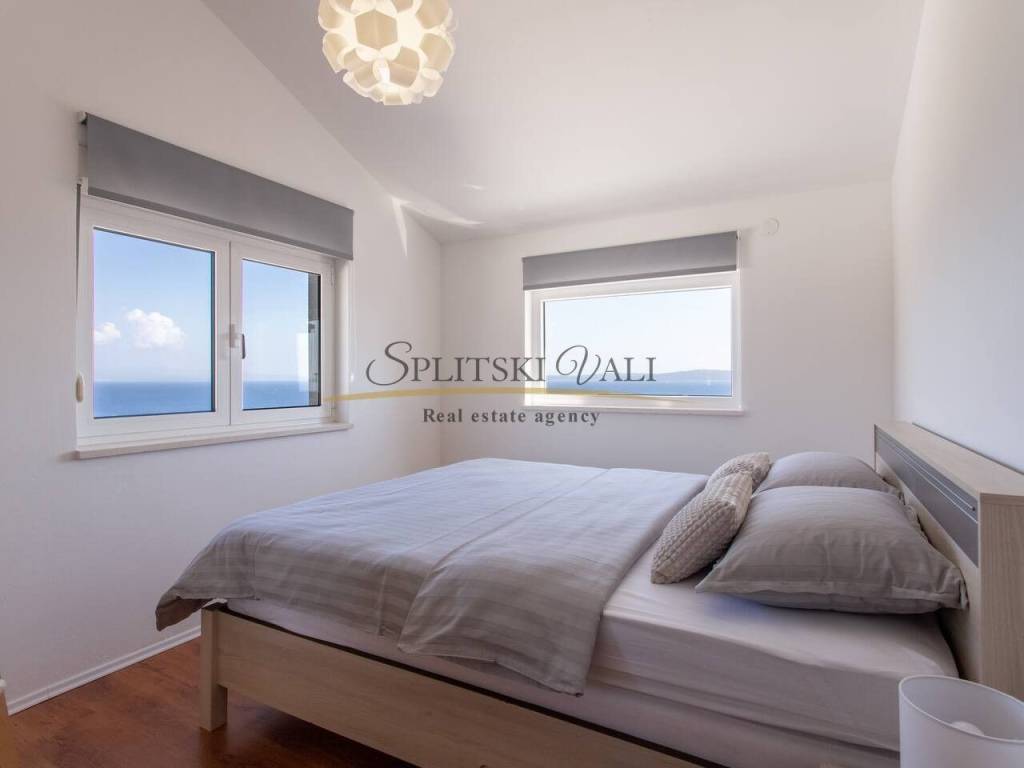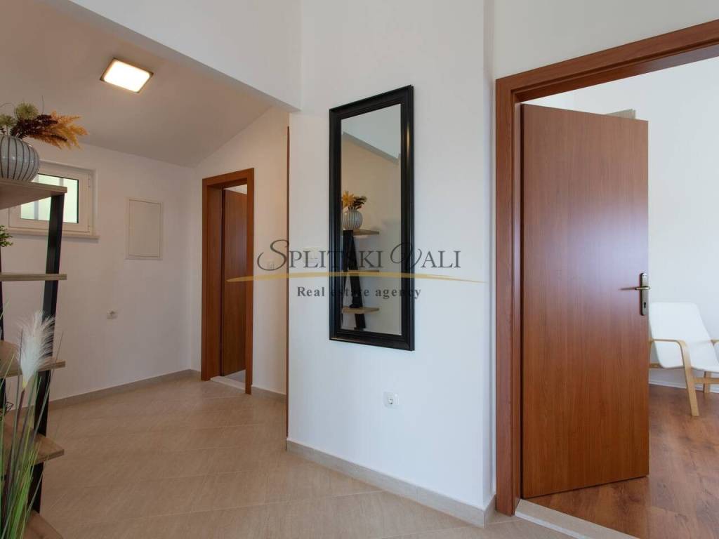 Kuća se sastoji od dva prostrana apartmana, što je čini idealnim izborom za obiteljski život ili kao izvrsnu investiciju u turistički najam. U prizemlju se nalazi dvosoban stan s terasom, dok se na prvom katu prostire još jedan dvosoban stan koji uključuje dvije spavaće sobe, kupaonicu, dodatni WC, hodnik, veliku kuhinju s blagovaonicom te prostrani dnevni boravak s izlazom na veliku terasu s koje se pruža prekrasan pogled na more.