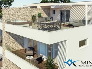 A semi-detached house is for sale 2 km from the sea and a beautifully landscaped beach. The house is located near Umag and is surrounded by new modern houses. na The house has a net area of 140 m2 and consists of 3 floors - ground floor, first floor and roof terrace with jacuzzi and summer kitchen. The terrace offers a beautiful view of nature and the sea. The house has a garden area of 375 m2 where a swimming pool can be placed. On the ground floor there is a living room with a kitchen and a dining room, from which there is access to a spacious terrace, and a bathroom with a toilet. On the first floor there are three bedrooms, each with its own bathroom and toilet and access to spacious terraces. The roof terrace offers a partial view of the sea, and there is a jacuzzi and a summer kitchen on it. The entire property consists of two such units, each with a separate entrance and a separate garden and 3 parking spaces. The price for the second house is EUR 470,000.00 EUR.