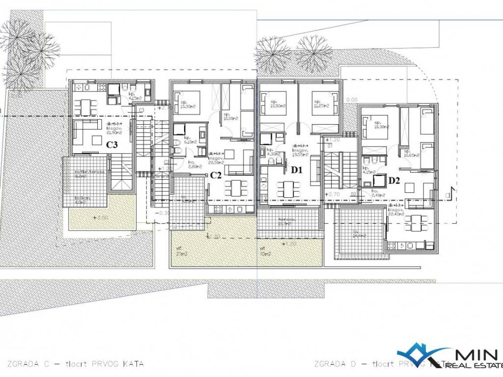 An apartment for sale in the vicinity of Umag in a quiet location. The apartment is located in Lovrečica and is 350 m from the sea and a beautifully landscaped beach and 5 km from the center of Umag. The apartment has a closed area of 45.60 m2 + covered terrace 10.70 m2, + garden 10 m2 + paved parking 12.50 + storage room on the ground floor of 7.55 m2, and after calculating the coefficient, apartment D1 has 67.21 m2. The apartment is located on the 1st floor of the building and consists of a bathroom, 2 bedrooms, a kitchen with a dining room and a living room with access to the terrace. The apartment can be used for residential or tourist purposes.