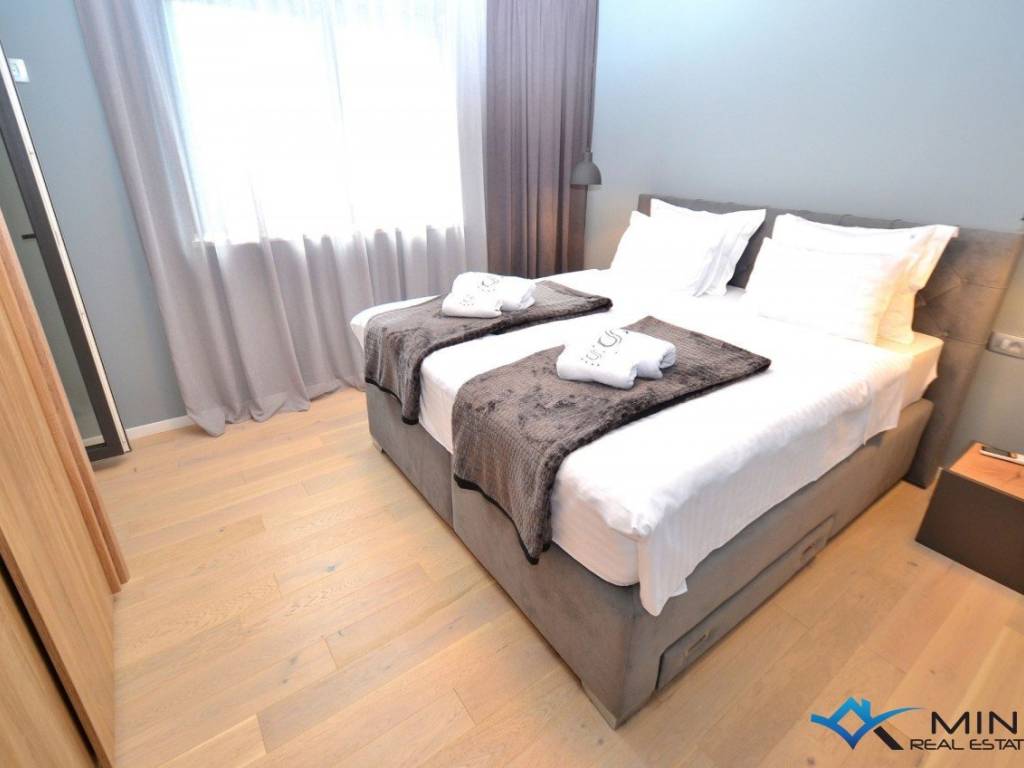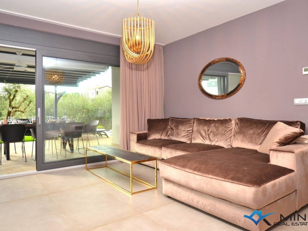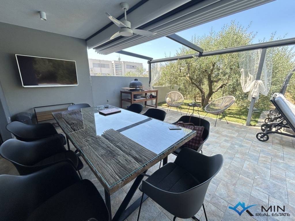 An apartment with a sea view is for sale in a quiet location surrounded by an olive grove. The apartment is located on the ground floor of a building with a total of 8 apartments. The apartment has 82 m2 and consists of a hallway, bathroom, 3 bedrooms and an open space room with a kitchen with a dining room and a living room with access to a terrace that is partially covered. The apartment has a beautifully landscaped garden of 172 m2 that is beautifully landscaped and has a swimming pool. Heating and cooling in the apartment is provided by air conditioning and underfloor heating. The apartment also has a private entrance through the courtyard, and the apartment has 1 parking space in front of the building. The distance from the sea and the beautifully landscaped beach is 900 m, and the city center is 1200 m away.