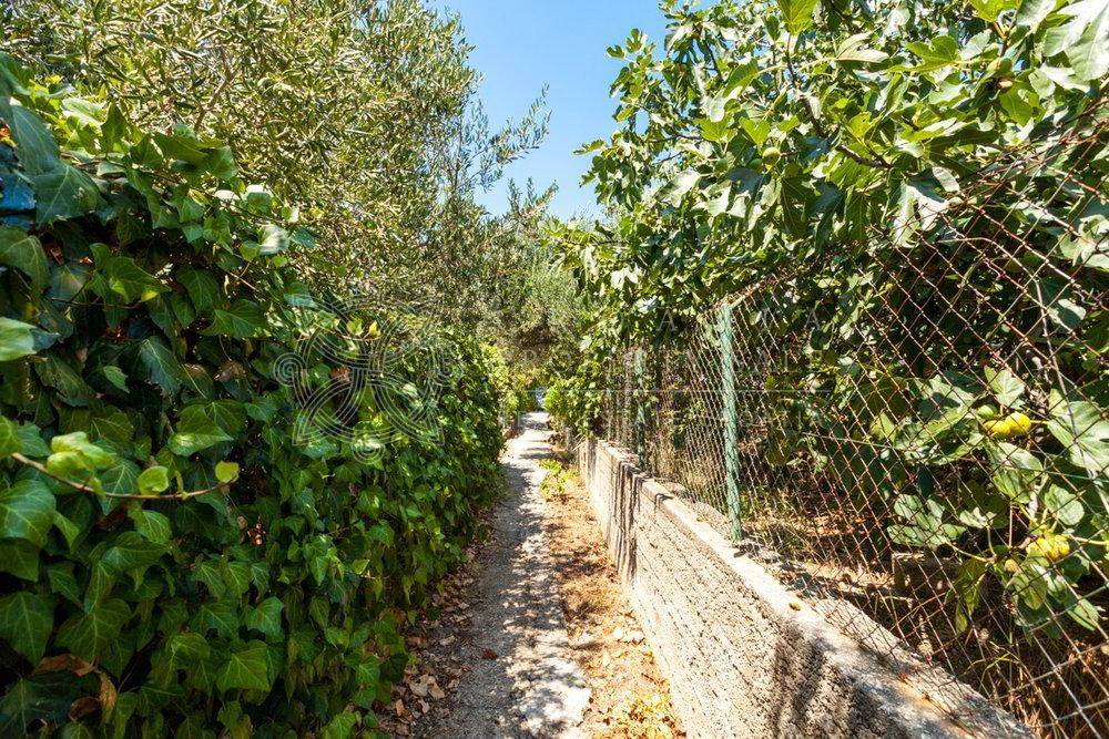 The ground floor features two bedrooms, a bathroom, a kitchen, a dining area, and a living room, all connected to a terrace that faces south, offering a partial sea view and views of the lush garden filled with Mediterranean plants like lemon, mandarin, olive, rosemary, and fig trees.