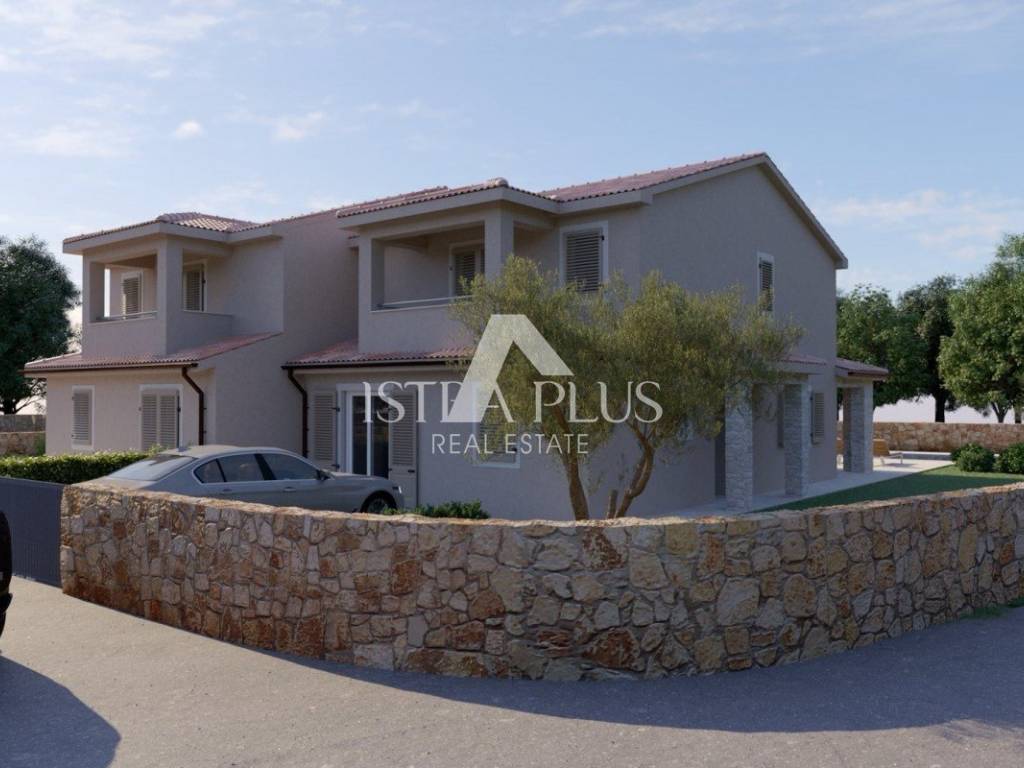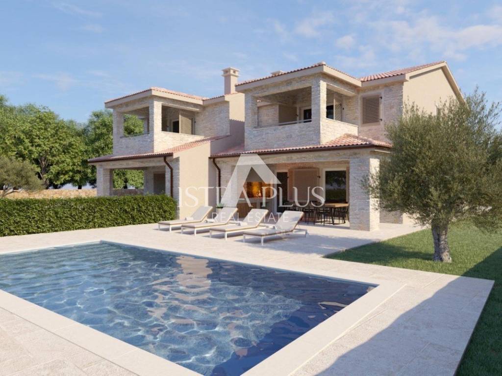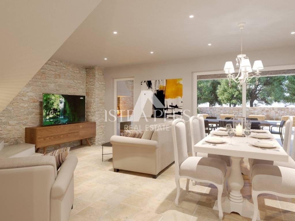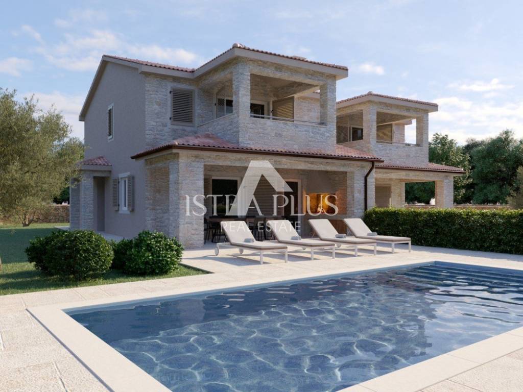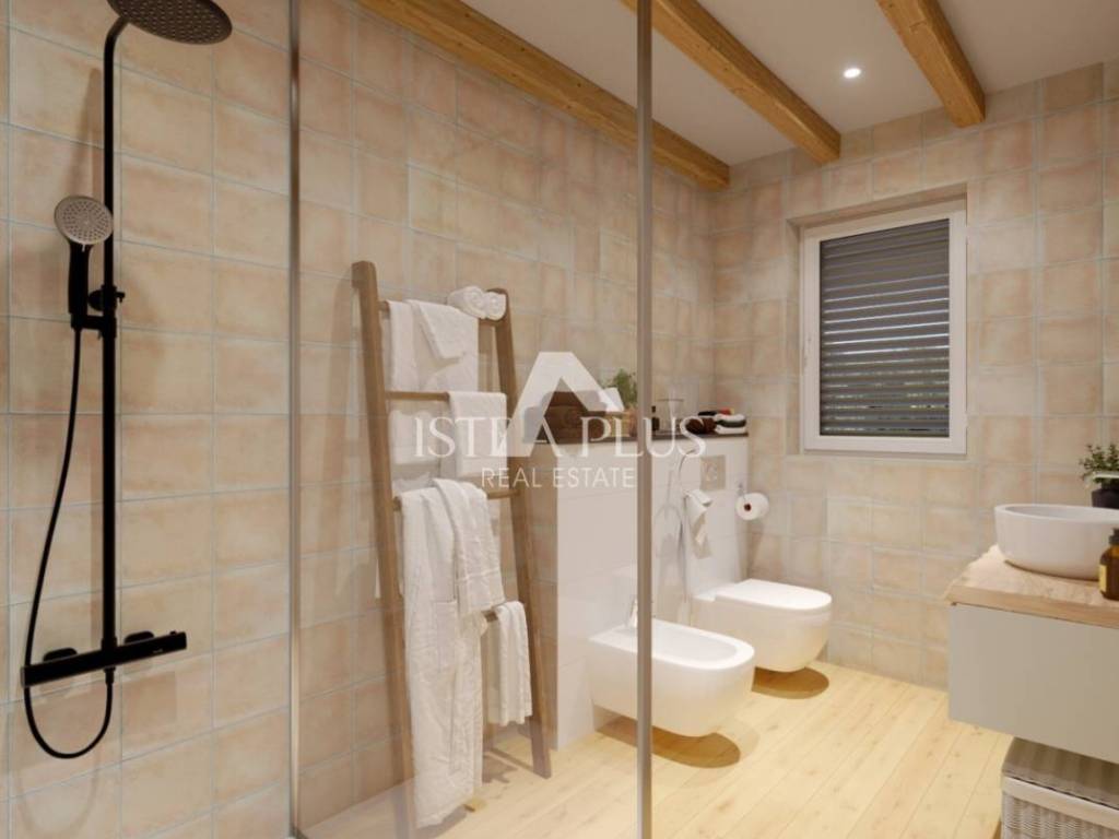 K237 The semi-detached house with a sea view is located 15 km from the center of Poreč and the sea. The house is located on a plot of 543 m2 and extends over the ground floor and the 1st floor. The ground floor of the house consists of an entrance hall, a bedroom with its own bathroom, a guest toilet, a storage room, a spacious living room, a kitchen and a dining room with access to a covered terrace with an outdoor kitchen, where there is a swimming pool and a beautifully landscaped garden. On the 1st floor there are two bedrooms, each with its own bathroom and a terrace with a view of the sea. The first phase of underfloor heating was implemented in the house, and air conditioners were installed in each bedroom and in the living room. Automatic irrigation was implemented in the yard. The carpentry is equipped with electric blinds. The parking space is in front of the house. The future buyer can choose the tiles/sanitaries while it is under construction. The planned completion of construction is at the end of 2025.
