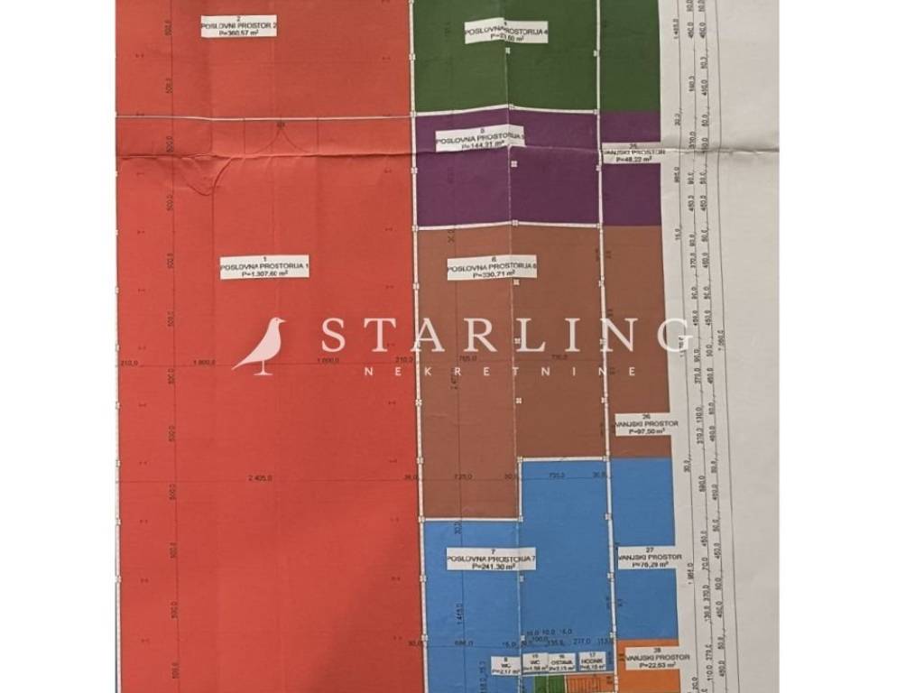 Prodaje se poslovna hala površine 1687 m2 (na tlocrtu označeno crvenom bojom), u Opuzenu. Uz halu se prodaju i 4 uredska prostora od 86 m2 (na tlocrtu označeno zelenom bojom).