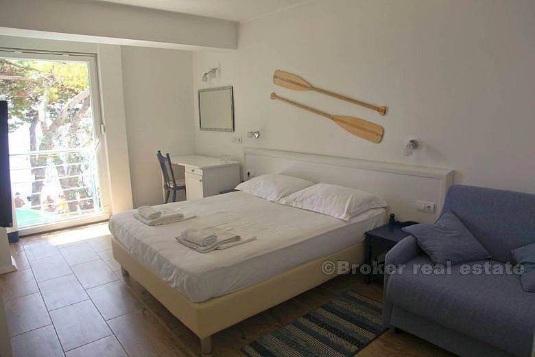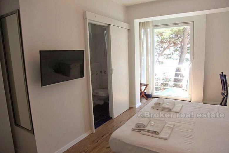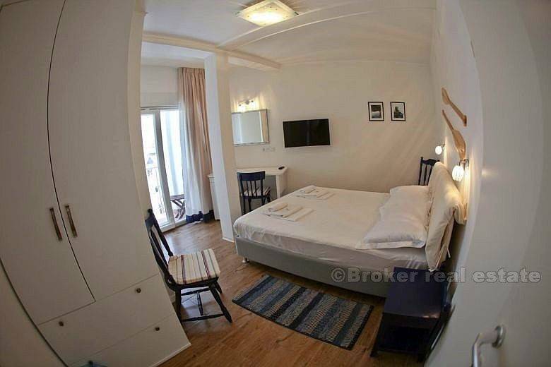 Mali obiteljski hotel posluje gotovo 50 godina. Temelji su izgrađeni 1960. godine i, osim tijekom rata u Hrvatskoj, nikada nije prestao s radom. Hotel prima samo 34 osobe, što omogućuje upravitelju osobni odnos sa svakim gostom. Tijekom postojanja hotela, većina gostiju bili su stalni gosti, jer kada se jednom zaljubite u njega, vaša potraga za opuštajućim odmorom je završena. Hotel je u potpunosti renoviran 2014. godine, dajući mu osvježavajući izgled i zadovoljavajući standarde današnjih gostiju.   Hotel nudi prostranu terasu ispred koja se koristi kao kafić. Terasa je u potpunosti prekrivena hladovinom koju pružaju borovi.   Na vrhu zgrade nalazi se prostrana terasa od 40 m2 potpuno okupana suncem. Pogled s vrha je nevjerojatan: sjedite odmah iznad borova, a preko njihovih vrhova proteže se prekrasno more sve do otoka Hvara, a s desne strane do otoka Brača.   Restoran i bar nalaze se u prizemlju hotela i nastavljaju se na manju vanjsku terasu. Restoran može primiti 34 gostiju u zatvorenom prostoru i 20 na otvorenom. Ovaj prostor je potpuno renoviran 2014. godine i potpuno je opremljen za posluživanje buffet doručka i à la carte jelovnika.   Sobe su također dizajnirane da budu povezane vratima i svaka ima unaprijed definirani prostor za mini kuhinju kako bi se sobe mogle iznajmljivati ​​kao apartmani. Ukupno ima 10 prostranih soba koje mogu primiti 28 gostiju.   Prostrani i luksuzni VIP apartman na trećem katu najbolje je što butik hotel nudi: ima preko 100 m2, uključuje saunu, kamin, hidromasažnu kadu, balkon, satelitsku TV, potpuno opremljenu kuhinju, mini kuhinju, 2 kupaonice, prima 6 osoba i ima prolaz na terasu od 40 m2 na vrhu zgrade. Po potrebi, apartman se također može podijeliti u 2 potpuno opremljena apartmana zaključavanjem jednih vrata.