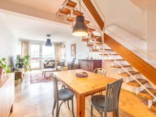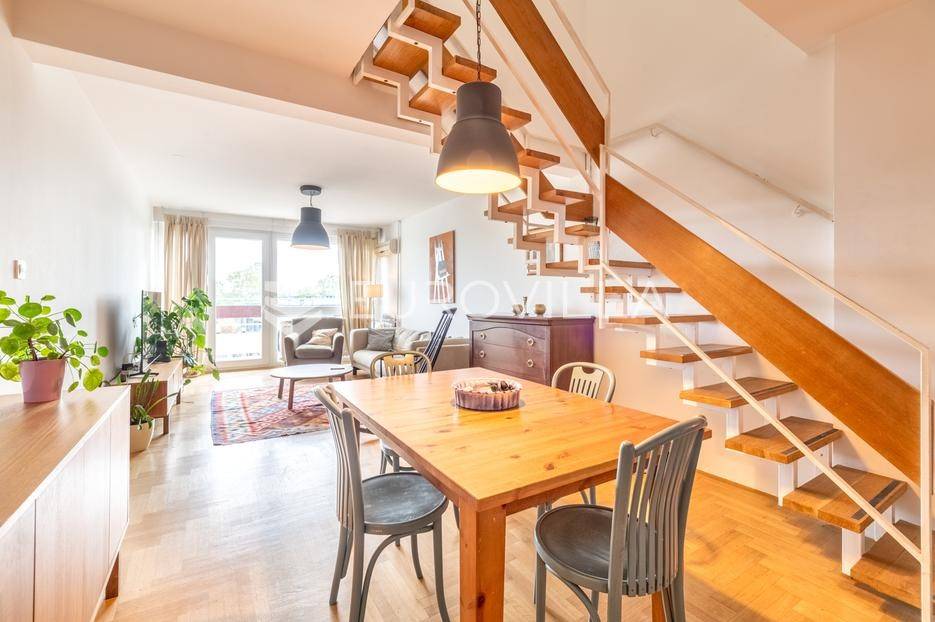 Zagreb, Siget, iznajmljuje se dvoetažni trosoban stan, površine 94 m2, adaptiran i namješten 2013. godine. Nalazi se na 5. katu stambene zgrade s liftom.Donja etaža: ulazni hodnik, gostinjski toalet, kuhinja s blagovaonicom, prostrani dnevni boravk i lođa.