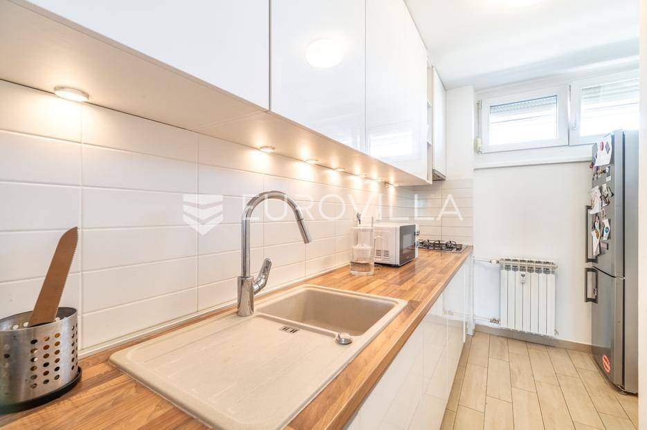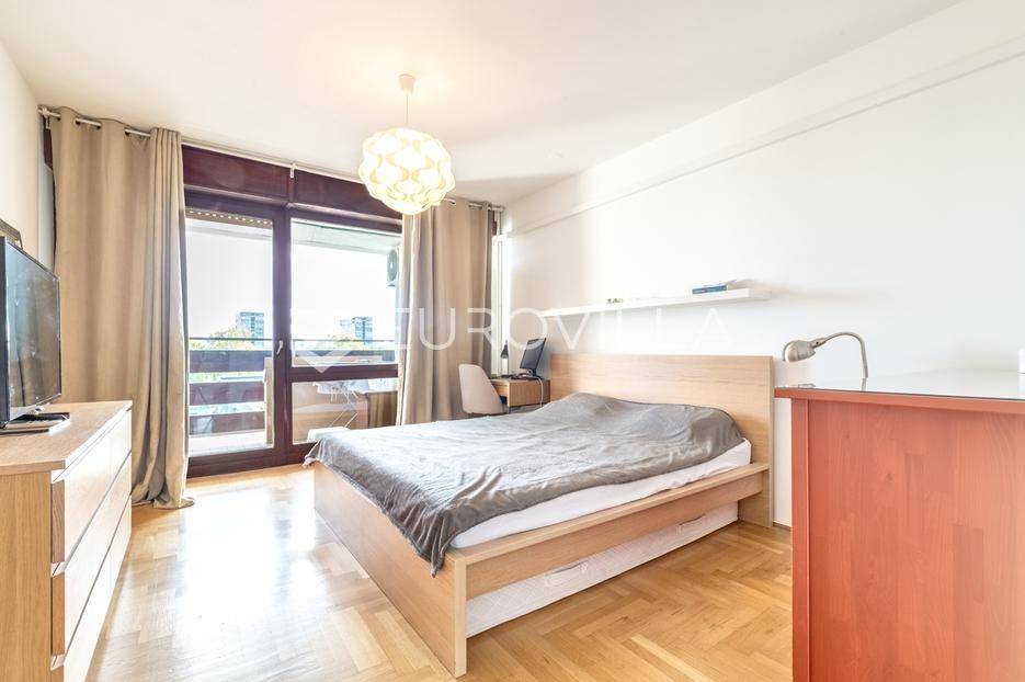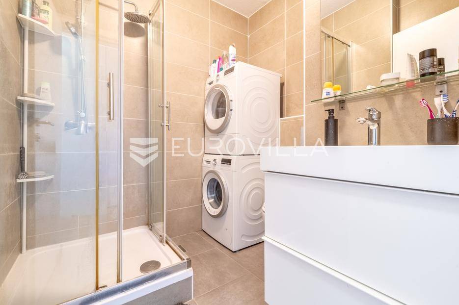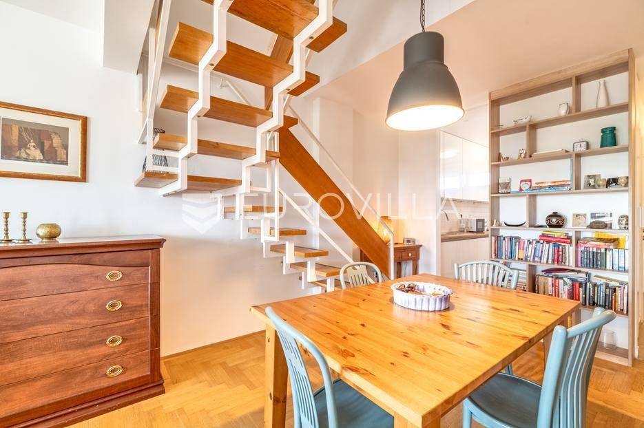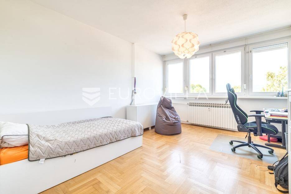 Gornja etaža: dvije prostrane spavaće sobe, hodnik s ugradbenim ormarima, kupaonica s perilicom i sušilicom rublja, te lođa s ugradbenim ormarima.Stan ima dva klima uređaja, orijentacija sjever-jug (pogled na Medvednicu i park).