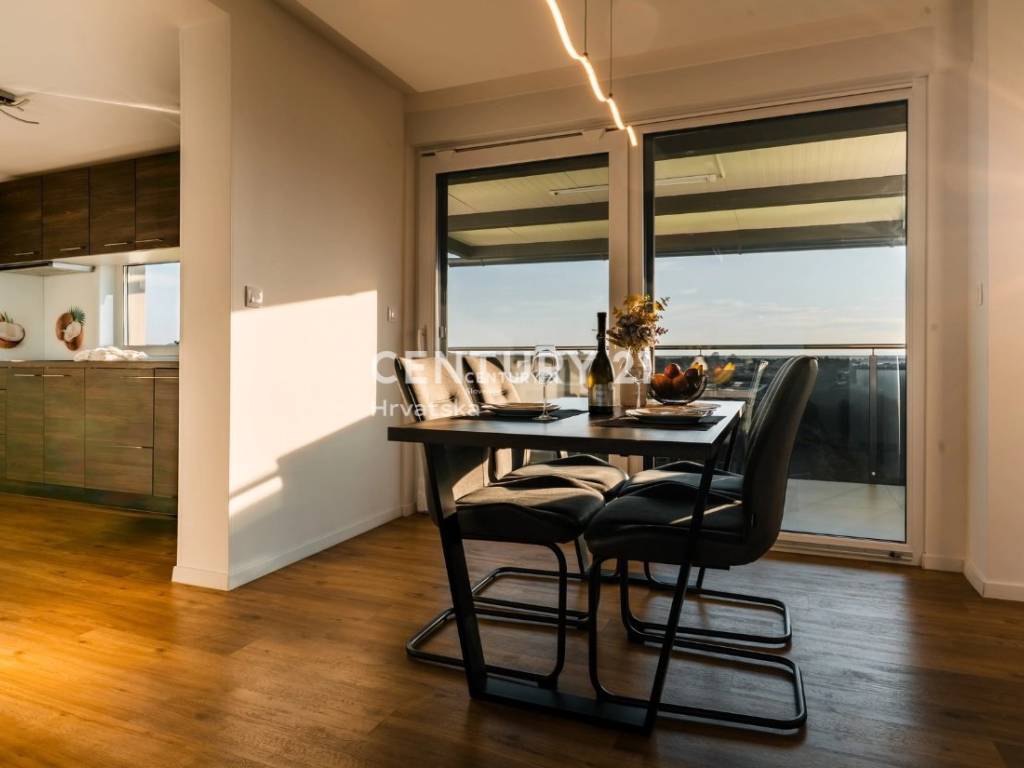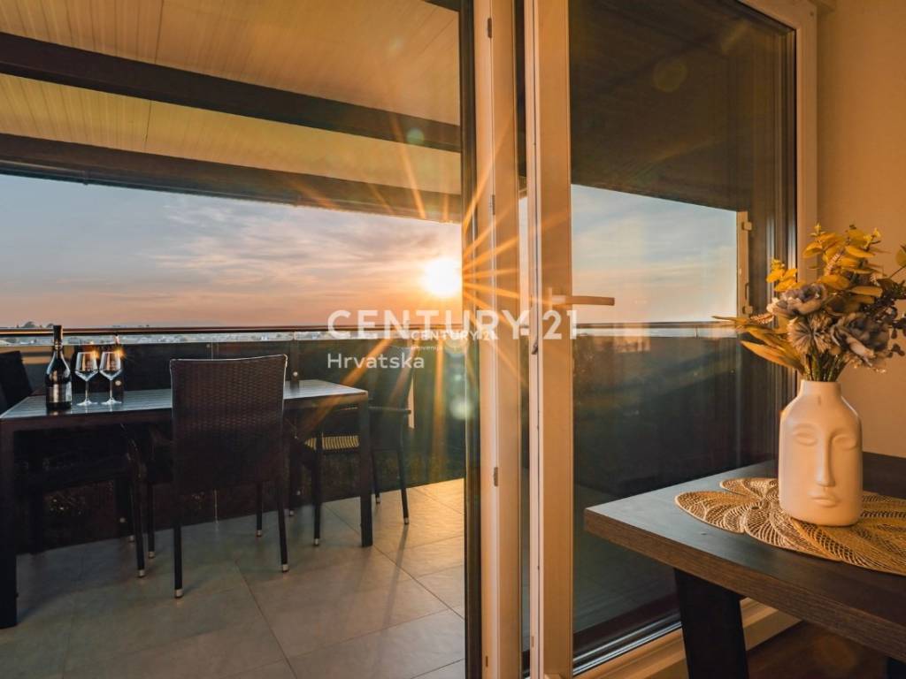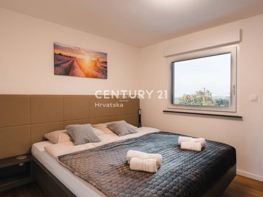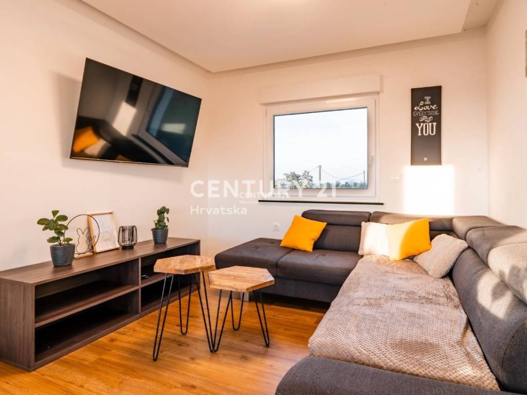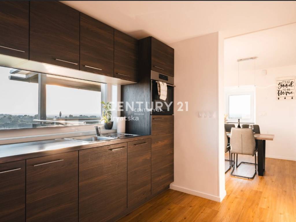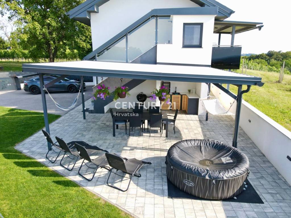 Gornji kat: kuhinja s pogledom, dnevni boravak, 2 spavaće sobe, kupaonica, balkon. Donji prostori: garaža i pomoćni prostor. Vrtna terasa s vanjskom kuhinjom, garniturom i jacuzzijem – za uživanje uz zalaske sunca.