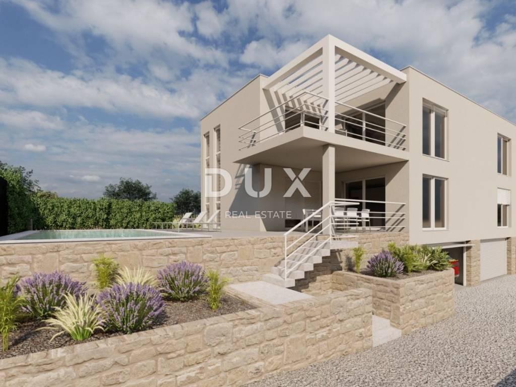 A semi-detached house in a new building is for sale, with a swimming pool and a beautiful panoramic view of the sea and the town of Vodice.