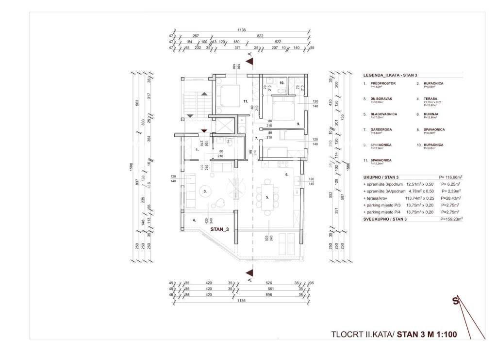 Четырехкомнатный пентхаус площадью 116,66 м² расположен на первом этаже современного жилого дома с лифтом, в привлекательном месте в Пунта-Скале, Петрчане. Квартира расположена в тихой и ухоженной части города, в непосредственной близости от моря и красивых пляжей, что делает эту недвижимость идеальной для спокойной семейной жизни или в качестве роскошной инвестиции для отдыха. Состоит из прихожей, двух ванных комнат, кухни, столовой и гостиной с выходом на террасу, трех спален и гардеробной. Квартире также принадлежит: • Кладовая в подвале 12,51 м2 • Кладовая в подвале 4,78 м2 • Терраса на крыше 113,74 м2 • Парковочное место P3 13,75 м2 • Парковочное место P4 13,75 м2 Общая полезная площадь квартиры составляет 159,23 м2. В строительстве будут применяться высокие стандарты строительства и обустройства, при этом будут использоваться только самые качественные материалы и оборудование. • Железобетонная конструкция, кирпичные стены. • Дерево-алюминиевые окна высшего качества • Marazzi//Mirage превосходный итальянский фарфор 1-й категории. • Дубовый паркет в комнатах. • Подогрев полов в ванных комнатах и гостиной. • Система Mitshubishi multi split • Камень в лестничных клетках и вход в здание. • Сантехника Villeroy&Boch • Парковка бетонные кубики. • Благоустроенные сады/ландшафтный дизайн • Противоударные двери. Планируемое начало строительства - сентябрь 2025 года, а завершение намечено к осени 2026 года. Эта недвижимость - отличная возможность для тех, кто ищет превосходный образ жизни в тихой средиземноморской среде и при этом хочет находиться недалеко от городских удобств, предлагаемых городом Задар. Близость ко всем основным удобствам делает это место идеальным выбором для отдыха, проживания или инвестиций. Для получения дополнительной информации или договоренности об осмотре, пожалуйста, свяжитесь с нами.