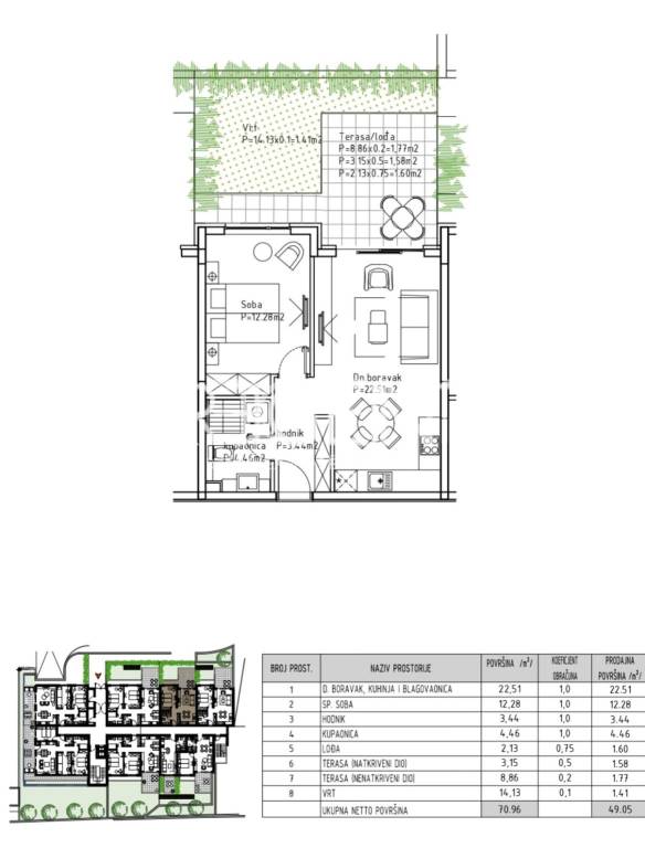 Мы выступаем посредниками в продаже однокомнатной квартиры в новостройке, расположенной в прекрасной Макарске. Квартира находится в отличном месте, недалеко от моря, магазинов и всех необходимых удобств для повседневной жизни.Площадь квартиры составляет 49,05 м2 и находится на первом этаже здания, состоит из коридора общей площадью 3,44 м2, ванной комнаты общей площадью 4,46, спальни общей площадью 12,28 м2, гостиной и кухни со столовой общей площадью 22,51 м2, лоджии общей площадью 1,60 м2, крытой террасы 1,58 м2, открытой террасы общей площадью 1,77 м2 и сада общей площадью 1,41 м2.В квартире также есть гаражное парковочное место, которое не включено в цену. Цена гаражного места на первом этаже составляет 25000 евро, а на втором этаже - 22 500 евро.Благодаря своей ориентации, эта квартира наполнена естественным светом и предоставляет возможность наслаждаться средиземноморским солнцем на просторной террасе. Квартира полностью оборудована кондиционером, а ванные комнаты оборудованы подогревом пола, что обеспечивает дополнительный комфорт.Эта квартира - идеальное сочетание комфорта и эстетики, предоставляющее вам дом, в котором вы будете чувствовать себя спокойно и комфортно, а благодаря своему расположению, она также идеально подходит для сдачи в аренду туристам.Ощутите живописную атмосферу Макарски, не выходя из этого современного и практичного пространства!