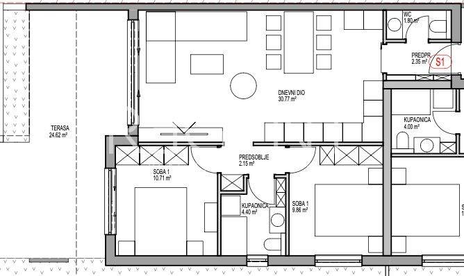 Квартира расположена на первом этаже проекта Strožanac Residence, новой современной застройки в тихой жилой части Strožanac Gornji. Квартира на первом этаже состоит из: прихожей площадью 2,35 м², туалета 1,80 м² и просторной гостиной 31,64 м². Также состоит из: двух спален, одна площадью 10,71 м², а другая 9,52 м², затем ванной комнаты 4,40 м² и прихожей 2,15 м². В квартире также есть лоджия 2,87 м². Общая полезная площадь квартиры составляет Квартира спроектирована с акцентом на функциональность и комфорт, с высокими стандартами строительства и тщательно отобранными материалами. Гаражное парковочное место стоит 25 000 евро. Планируемое завершение работ намечено на конец лета 2027 года. Для получения дополнительной информации, а также для согласования осмотра, пожалуйста, свяжитесь с нами!