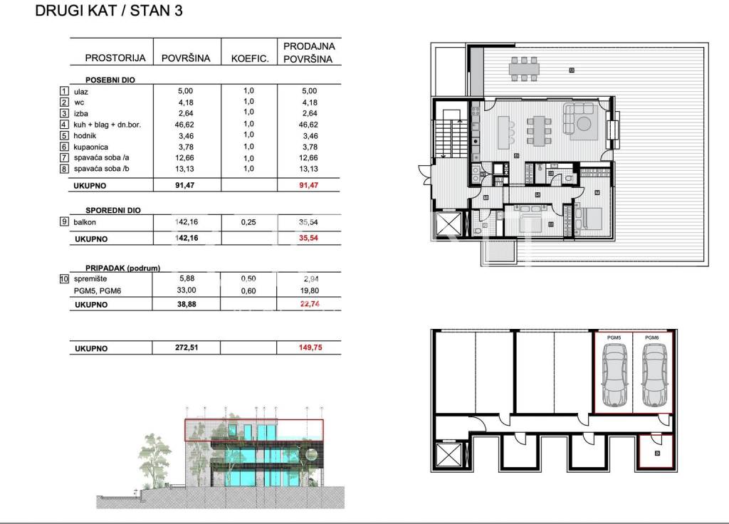 На втором этаже современной городской виллы в Горни Буковец находится элегантная квартира, которая сочетает в себе современный дизайн, тихое местоположение и исключительный комфорт. Расположенная в зелени и тишине, эта квартира представляет собой идеальный дом для пар или небольших семей, которые хотят наслаждаться покоем, находясь при этом близко к городу. Квартира имеет общую продажную площадь 91,47 м², состоит из прихожей, открытой гостиной с кухней и столовой площадью 46,62 м², двух спален, ванной комнаты, дополнительного туалета и кладовки. Из гостиной выходит на впечатляющий балкон площадью 142 м², который окружает квартиру и обеспечивает панорамный вид на зелень Буковца и город. Большие стеклянные стены соединяют интерьер с внешним пространством, создавая ощущение открытости и света. Планировка функционально организована, с отдельной спальной зоной, обеспечивающей уединение, в то время как гостиная излучает простор и тепло. Квартира включает в себя кладовую и два гаражных парковочных места в подвале здания. Вилла выполнена в соответствии с высокими стандартами энергоэффективности и оснащена высококачественными материалами – алюминиевыми столярными изделиями с тройным остеклением, полом с подогревом, кондиционированием воздуха и противовзломными дверями. Окружающая среда тихая и зеленая, с быстрым доступом к Максимиру, центру города, школам, детским садам и магазинам. Благодаря своему расположению и качеству исполнения, квартира представляет собой идеальное сочетание уединения, комфорта и практичности. Для получения дополнительной информации, пожалуйста, свяжитесь с нами.