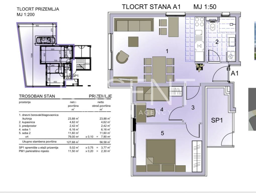 Квартира A1 расположена на первом этаже, в отличном месте в тихой части Трогира. Находится в качественном новом здании и идеально подходит для семей или пар, ищущих тишину и уединение с собственным открытым пространством. Квартира имеет общую чистую площадь 49 м², состоит из прихожей, двух спален, ванной комнаты, гостиной с кухней и столовой и выходом в сад площадью 79 м². К ней относится собственное парковочное место и отдельное кладовое помещение на первом этаже здания, идеально подходящее для хранения вещей или оборудования. Оборудована ПВХ столярными изделиями, кондиционером и керамическими полами во всех комнатах. Каждая комната имеет много естественного света, а гостиная имеет прямой выход в сад. Недвижимость расположена в тихой жилой зоне с отличным транспортным сообщением и близостью ко всем важным объектам - школы, магазины, парки и общественный транспорт находятся всего в нескольких минутах ходьбы. Море и пляж находятся в нескольких минутах ходьбы. Здание находится в стадии строительства, завершение работ запланировано на 12-14 месяцев. Заселение будет возможно сразу после завершения. Для получения дополнительной информации или организации осмотра, пожалуйста, свяжитесь с нами.