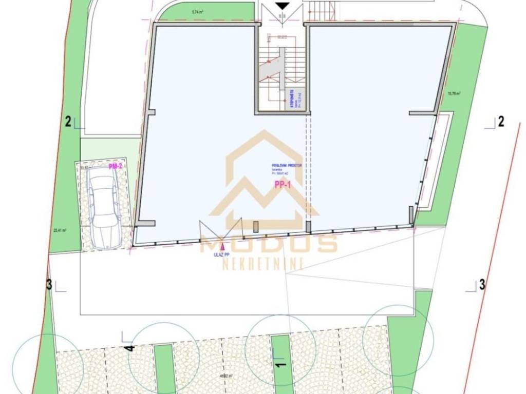 Sastoji se od poslovnog prostora u prizemlju i 7 stambenih jedinica i podzemnom garažom.