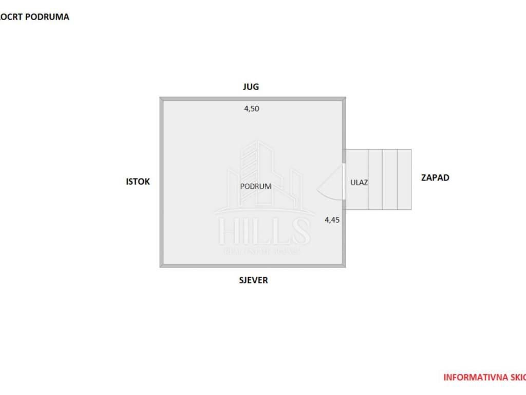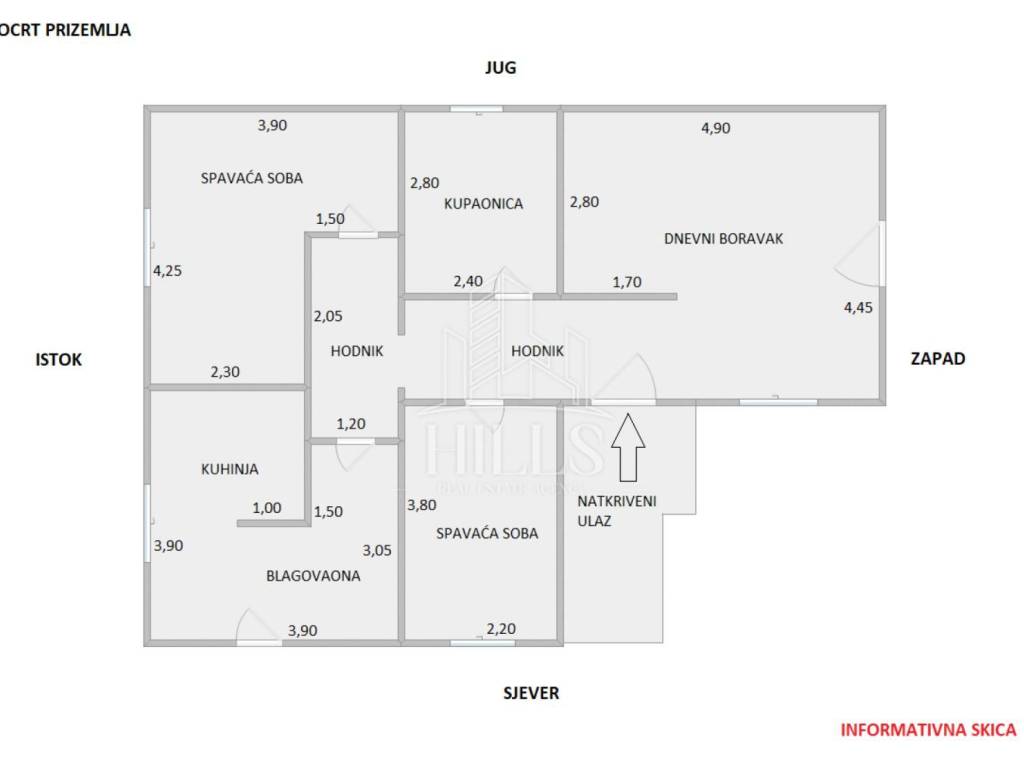 Prizemlje se sastoji od hodnika koji vodi u dnevni boravak, kupaonicu i spavaću sobu, te dalje u kuhinju s blagovaonicom i još jednu spavaću sobu i ima ukupno 70 m2. Podrum ima 20 m2, a sadrži jednu spremišnu prostoriju, kao i tavanski prostor.