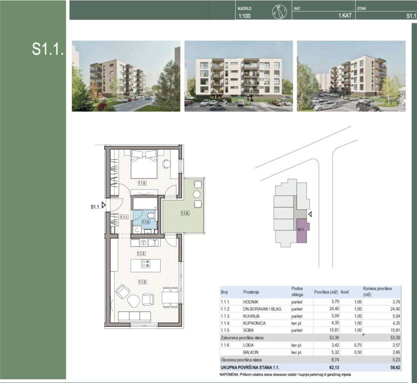 Dvosoban stan na 1. katu stambene zgrade zatvorene površine 53,39 m2 s loggiom 3,42 m2 (NKP 2,57 m2) i balkonom 5,32 m2 (NKP 2,66 m2), ukupni NKP 58,62 m2.Stan S-1-1 sastoji se od ulaznog prostora, dnevnog boravka s blagovaonicom, kuhinje, kupaonice, spavaće sobe i loggie/balkona.Obavezna kupnja vanjskog ili garažnog parkirnog mjesta i ostave.Stan se nalazi u višestambenoj zgradi koji sadrži 26 moderno opremljene stambene jedinice. Moderna i kvalitetna novogradnja u mirnoj i tihoj ulici.U neposrednoj blizini nalazi se specijalna bolnica za medicinsku rehabilitaciju, Aquae Vivae - moderan vodeni park i wellness centar, trgovine, škole, vrtići i ambulante, kafići, restorani i šetnice.Useljenje 05/2027. godineOstale informacije na upit.