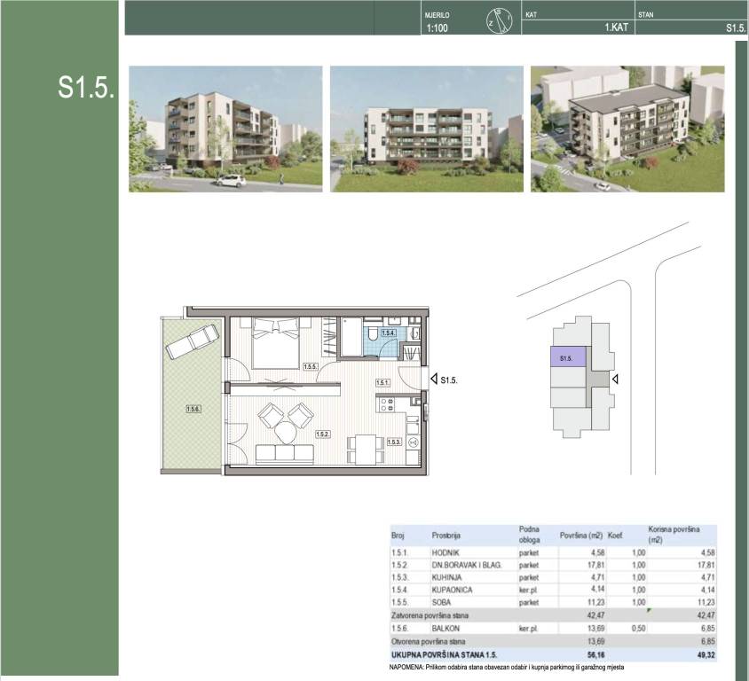 Dvosoban stan na 1. katu stambene zgrade zatvorene površine 42,47 m2 s balkonom 13,69 m2 (NKP 6,85 m2), ukupni NKP 49,32 m2.Stan S-1-5 sastoji se od ulaznog prostora, dnevnog boravka s blagovaonicom, kuhinje, kupaonice, spavaće sobe i balkona.Obavezna kupnja vanjskog ili garažnog parkirnog mjesta i ostave.Stan se nalazi u višestambenoj zgradi koji sadrži 26 moderno opremljene stambene jedinice. Moderna i kvalitetna novogradnja u mirnoj i tihoj ulici.U neposrednoj blizini nalazi se specijalna bolnica za medicinsku rehabilitaciju, Aquae Vivae - moderan vodeni park i wellness centar, trgovine, škole, vrtići i ambulante, kafići, restorani i šetnice.Useljenje 05/2027. godineOstale informacije na upit.