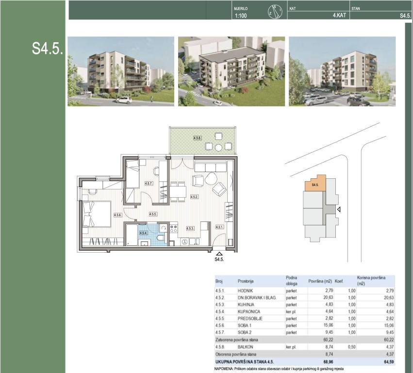 Trosoban stan na 4. katu stambene zgrade zatvorene površine 60,22 m2 s balkonom 8,74 m2 (NKP 4,37 m2), ukupni NKP 64,59 m2.Stan S-4-5 sastoji se od ulaznog prostora, dnevnog boravka s blagovaonicom, kuhinje, kupaonice, dvije spavaće sobe i natkrivenog balkona.Obavezna kupnja vanjskog ili garažnog parkirnog mjesta i ostave.Stan se nalazi u višestambenoj zgradi koji sadrži 26 moderno opremljene stambene jedinice. Moderna i kvalitetna novogradnja u mirnoj i tihoj ulici.U neposrednoj blizini nalazi se specijalna bolnica za medicinsku rehabilitaciju, Aquae Vivae - moderan vodeni park i wellness centar, trgovine, škole, vrtići i ambulante, kafići, restorani i šetnice.Useljenje 05/2027. godineOstale informacije na upit.