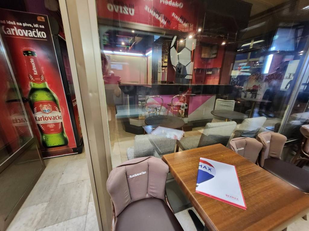 Caffe bar površine 36 m2 ima sanitarni čvor i malo spremiše iza šanka te zasebno skladište od 9 m2.