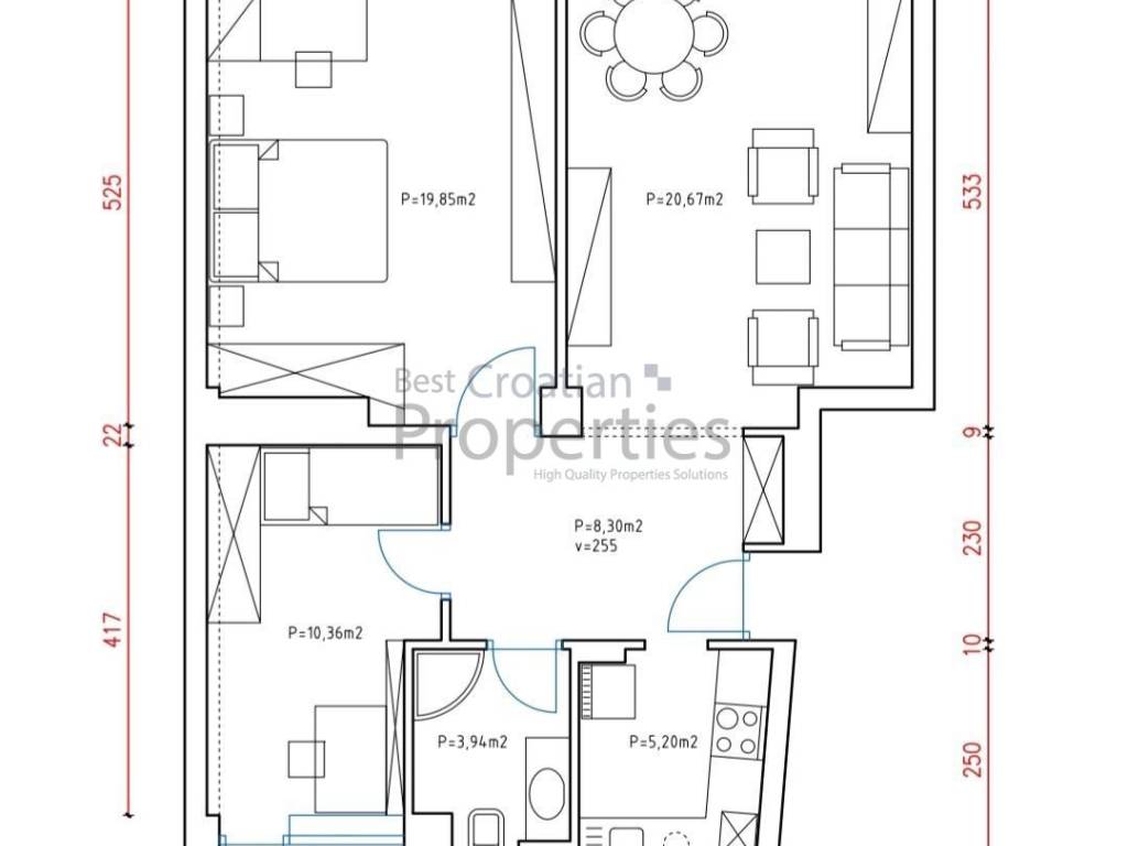 Površina stana iznosi 68m2, a sastoji se od predsoblja, dnevnog boravka s kuhinjom i blagovaonicom, dvije spavaće sobe, kupaonice i dva balkona.