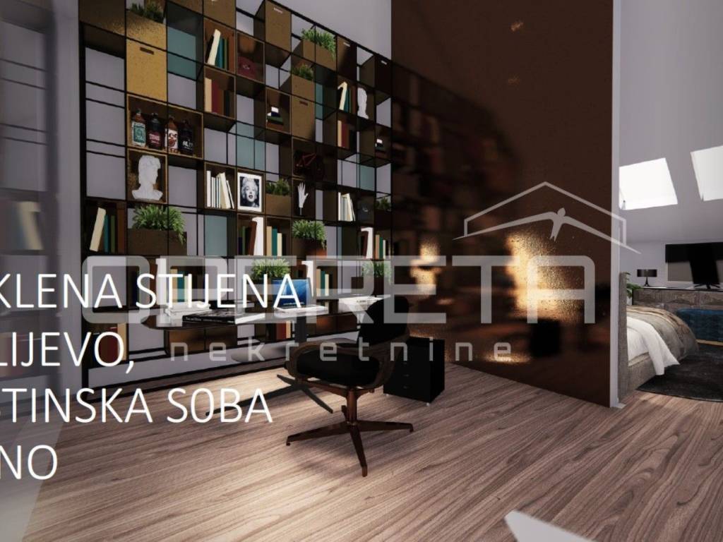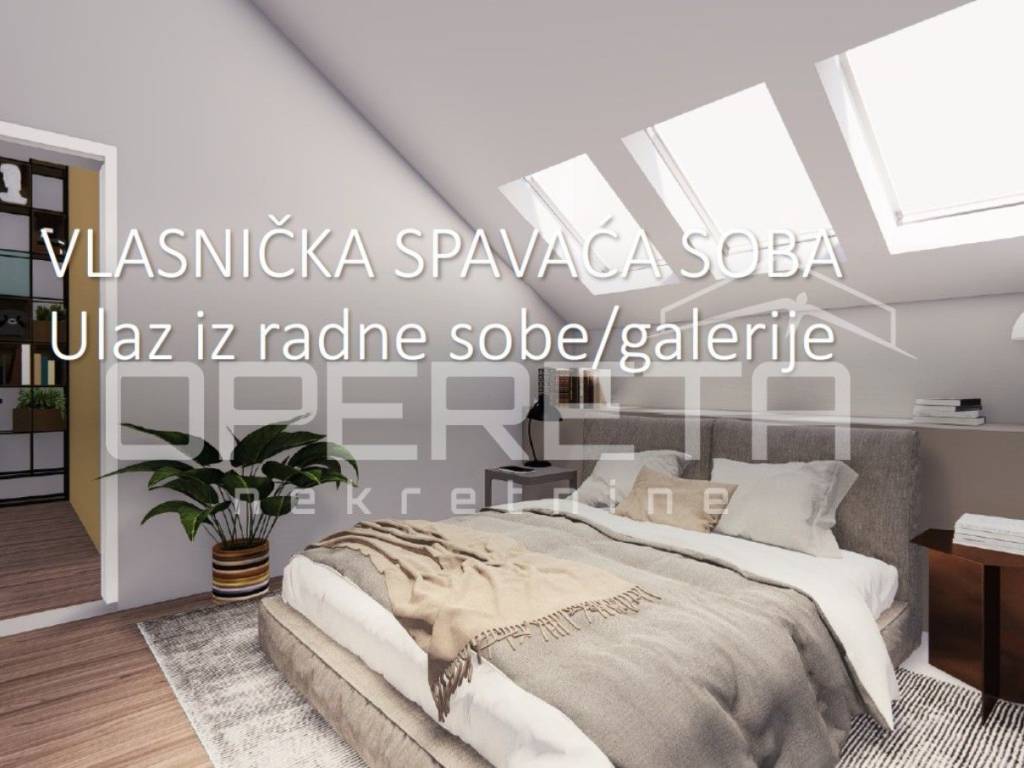 Na gornjoj etaži je predprostor namijenjen radnom dijelu /biblioteci ili sl, 2 sobe, kupaonica i spremište.