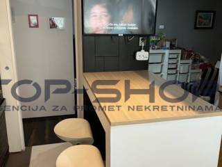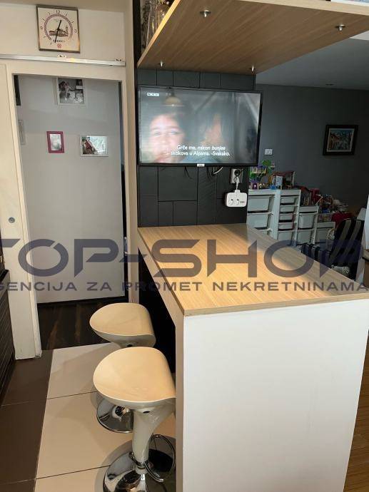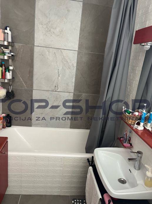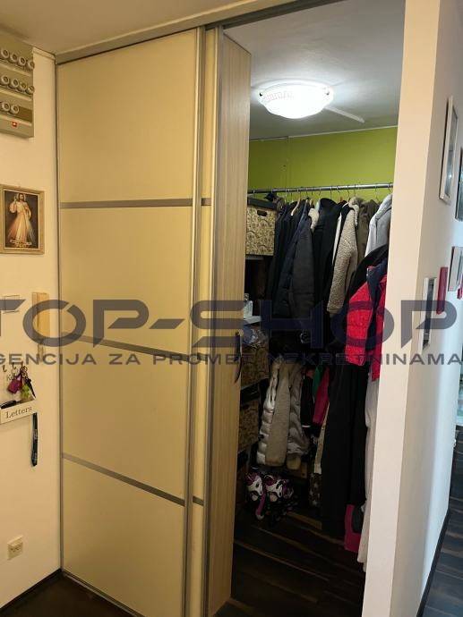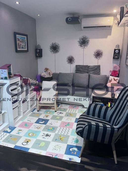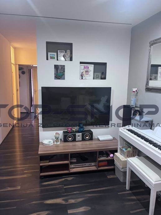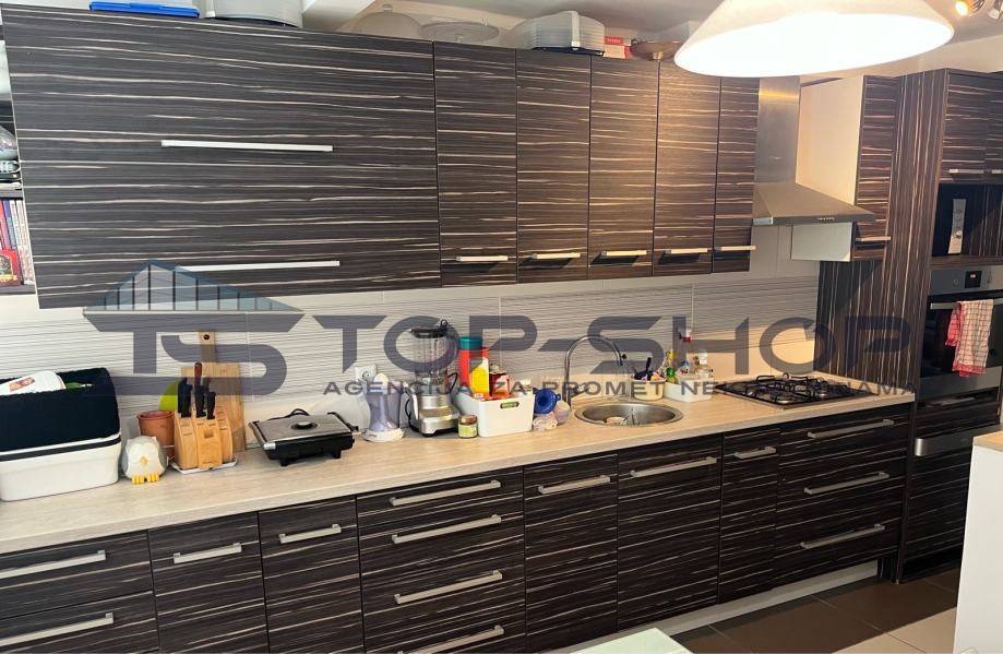 Stan se sastoji od 3 spavace sobe ,dnevni boravak, kuhinja i blagavaona, walk-in ormar, odvojeni wc, kupaona, ostava,dodatna zajednička prostorija na katu i terasa površine 30 m2 koja nije u vlasničkom listu, ali jedino predmetni stan ima izlaz na predmetnu terasu. Kuhinja je kompletno opremljena sa SBS hladnjak, perilica posudja, u stanu ostaju i televizori, projektor sa elektricnim platnom, 3 klima uredjaja...