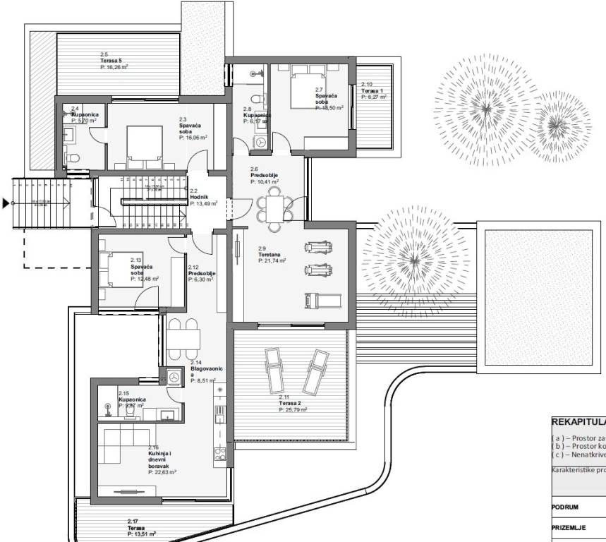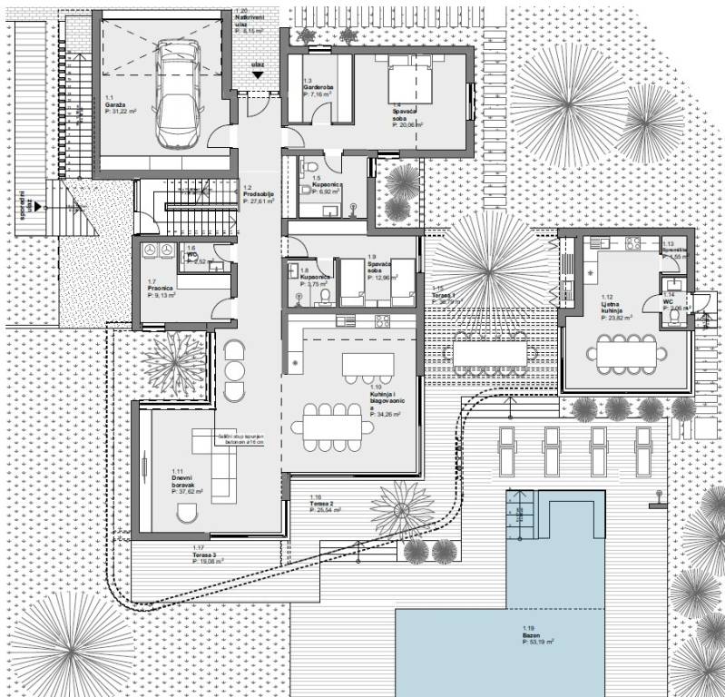 - 3 крытых парковочных места, 3 открытых парковочных места, гараж, крытый вход, прихожая, спальня 1 с гардеробной и ванной комнатой, гостевой туалет, прачечная, спальня 2 с ванной комнатой, кухня и столовая, гостиная, летняя кухня с туалетом и кладовой, 3 большие террасы, просторный бассейн площадью 53,19 м²