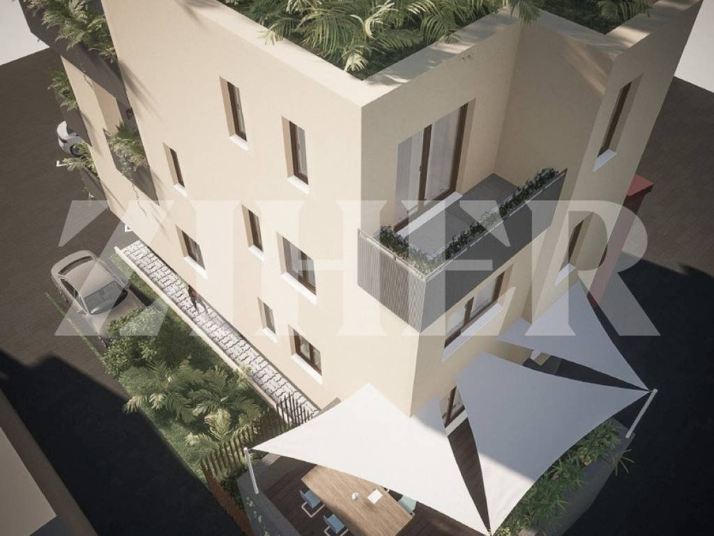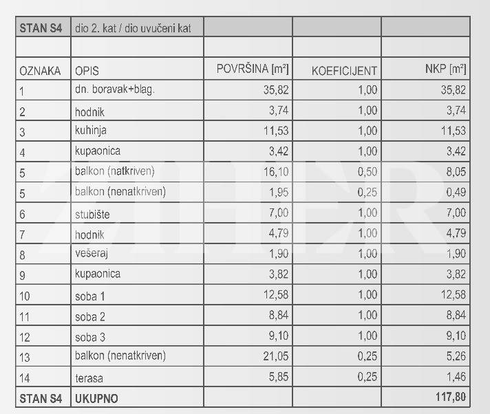 Na prvoj etaži se nalazi dnevni boravak s blagavaonicom i kuhinjom, izba, kupaonica i terasa od 18 m2, a na katu su tri spavaće sobe, kupaonica, terasa od 6 m2 i terasa od 21 m2, a pripadaju mu dva vanjska parkirna mjesta i spremište u podrumu od 16 m2.