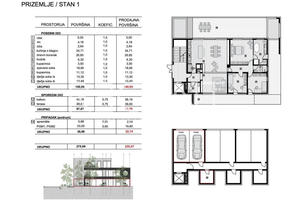 Квартира расположена на первом этаже современной виллы с тремя жилыми блоками, расположенной на тихой улице Горни-Буковец. Это место сочетает в себе зелень, уединение и приятную семейную атмосферу, а также отличную транспортную доступность с остальной частью города. Квартира имеет общую площадь 235,57 м², состоит из просторной гостиной с кухней и столовой открытой планировки, трех спален, двух ванных комнат, дополнительного туалета, кладовой и коридора. Из гостиной есть выход на балкон и террасу общей продаваемой площадью 72,79 м², идеально подходящую для общения, трапезы и отдыха на открытом воздухе. Планировка помещений продуманная и функциональная, большие стеклянные стены обеспечивают обилие естественного света. Спальная зона квартиры расположена в более тихой части, а гостиная предлагает комфортное пространство для семейных посиделок. В стоимость квартиры входят кладовая и два гаражных парковочных места в подвале здания. Здание построено в соответствии с высокими стандартами энергоэффективности и оснащено современными системами отопления и охлаждения, алюминиевыми столярными изделиями с тройным остеклением, противовзломными дверями и качественными отделочными материалами. Окружающая среда тихая и зеленая, рядом есть все необходимые удобства – школа, детский сад, магазины и общественный транспорт. Максимир и центр города находятся всего в нескольких минутах езды, что делает это место идеальным сочетанием уединения и городского комфорта. Для получения дополнительной информации, пожалуйста, свяжитесь с нами.